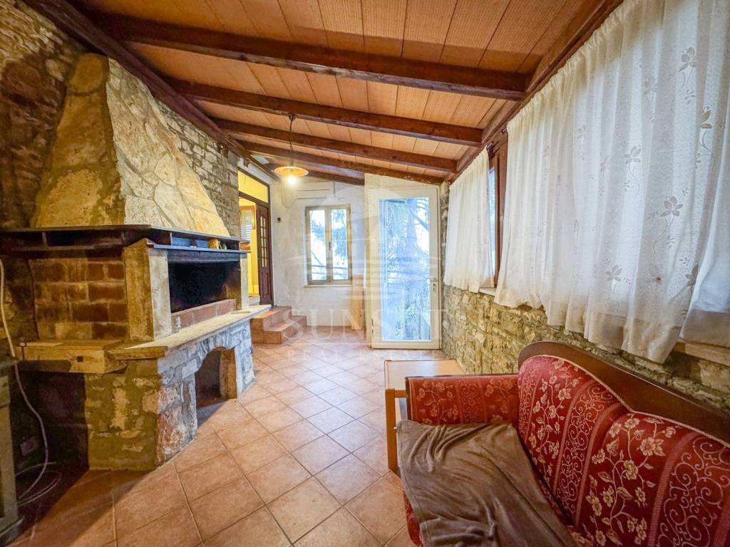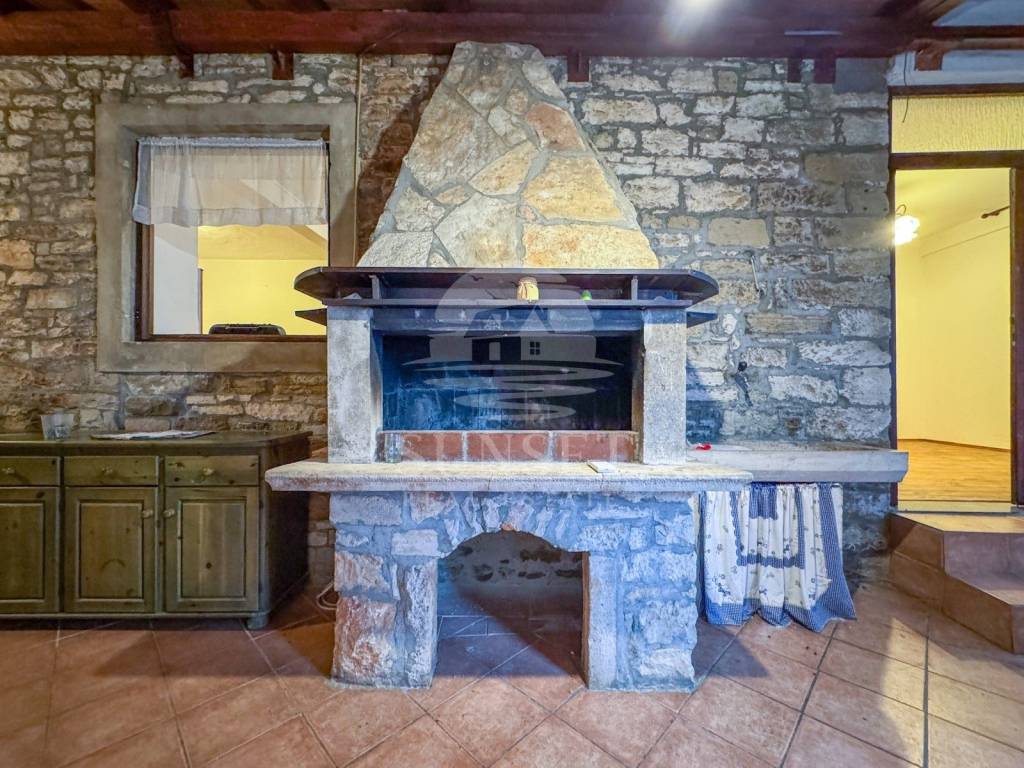 На первом этаже расположен входной холл, который одновременно служит центральным пространством дома. Помещение очень светлое, с большим количеством окон, а особую атмосферу создают камин и большая каменная раковина. Это пространство предназначено для встреч с семьёй и друзьями, совместных ужинов и приятных посиделок с вином, хорошей едой и разговорами, особенно в холодное время года у камина.