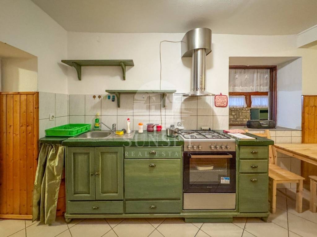 Из этого помещения осуществляется вход на высокий первый этаж, где расположены кухня с обеденной зоной, одна спальня и ванная комната.