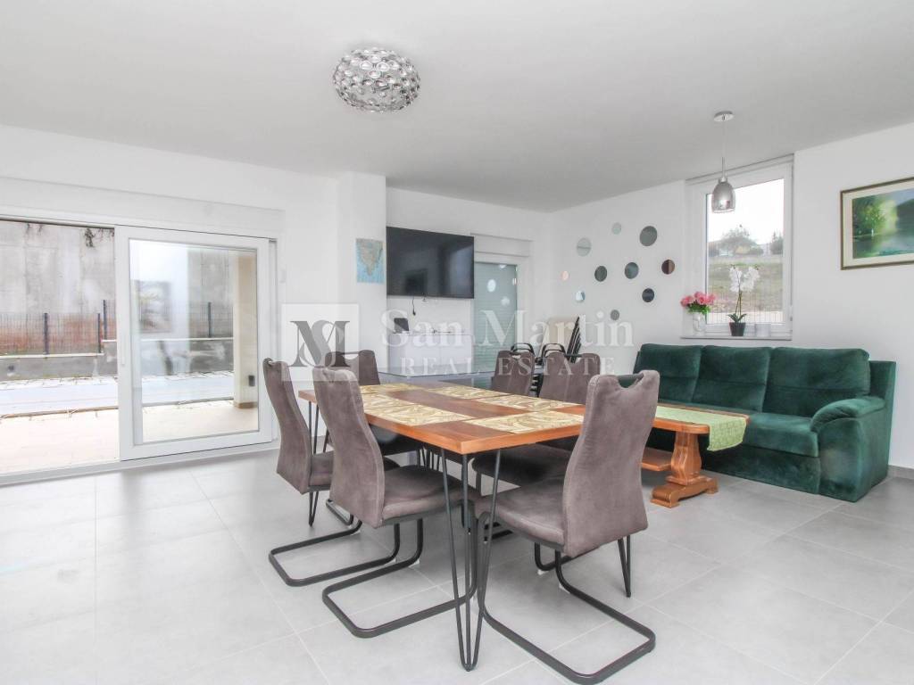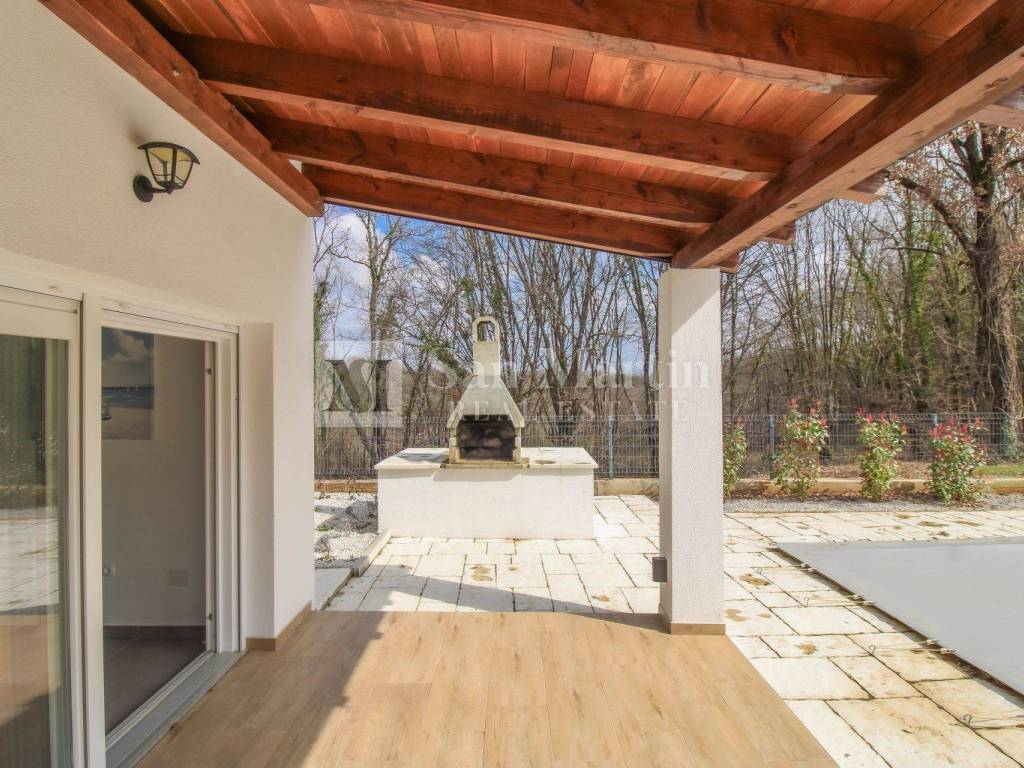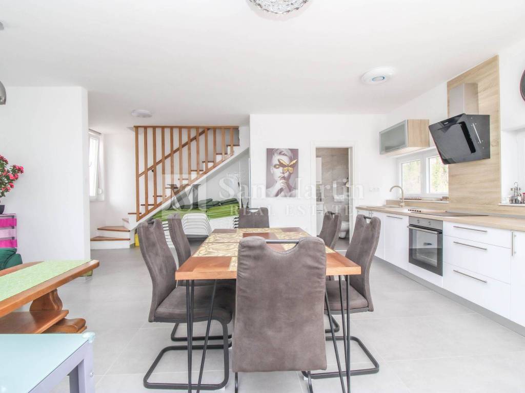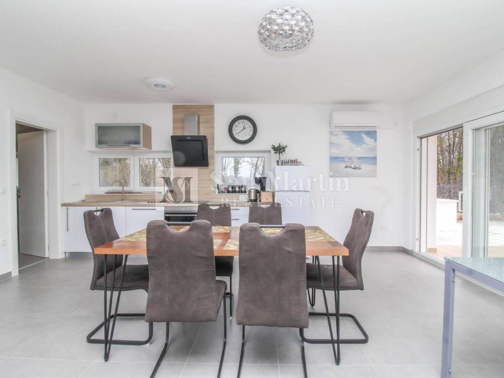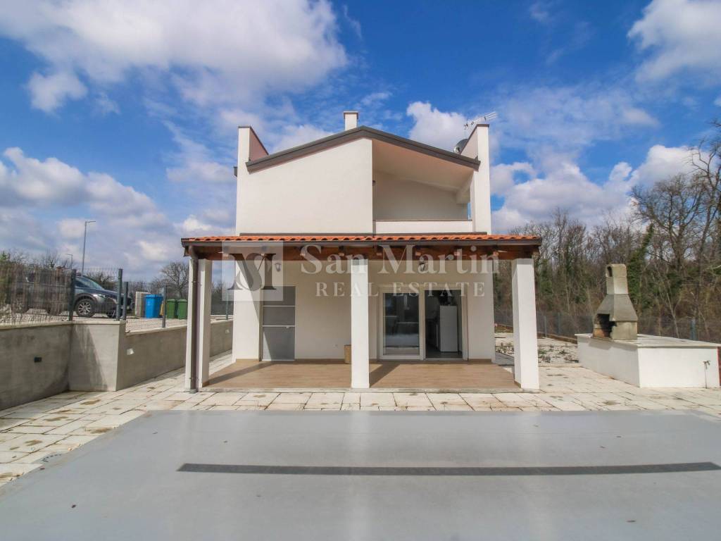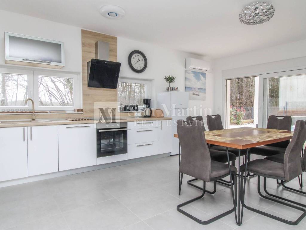 A modern semi-detached house is for sale in the vicinity of Poreč, which is located on a plot of 353 m2 and its total area is 84 m2. The house is spread over two floors. On the ground floor, there is an open-concept living room, kitchen and dining room, as well as a bathroom. there are two bedrooms and one bathroom on the first floor.