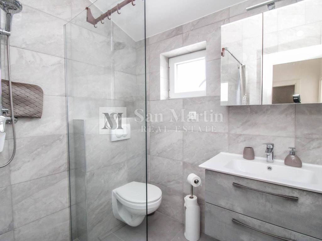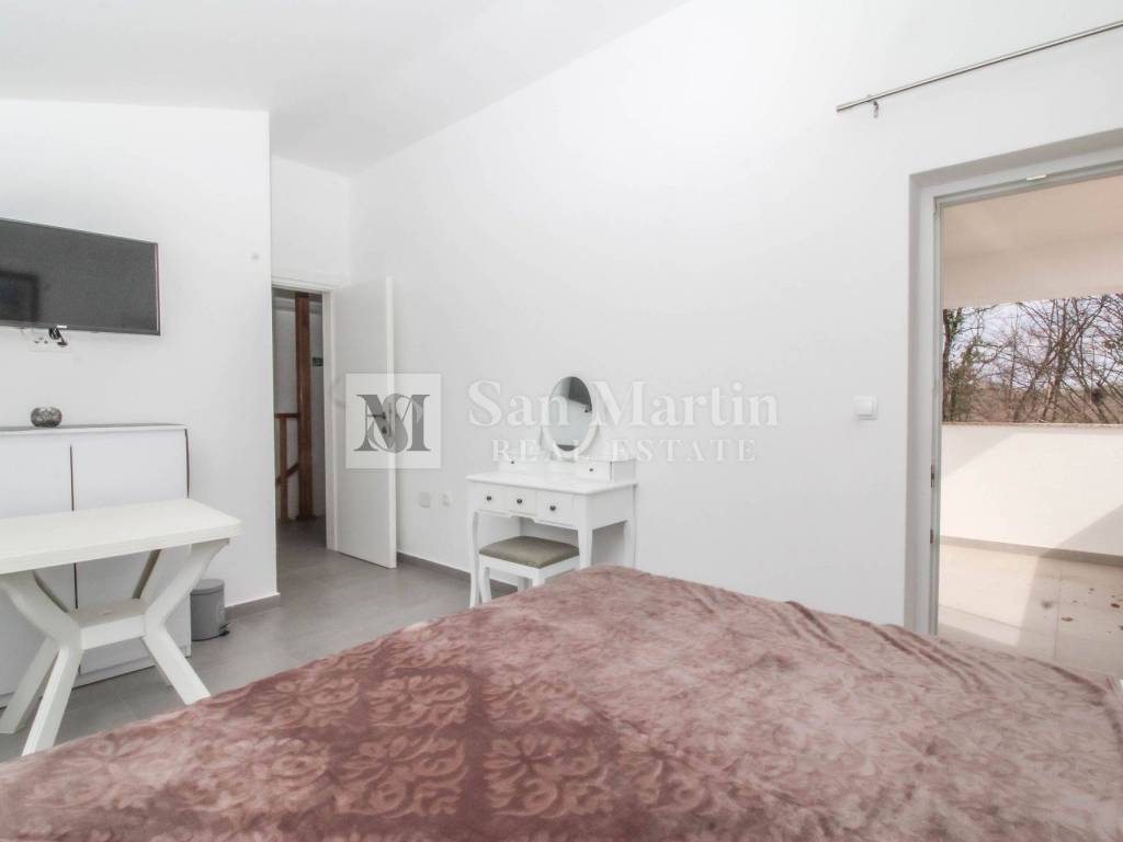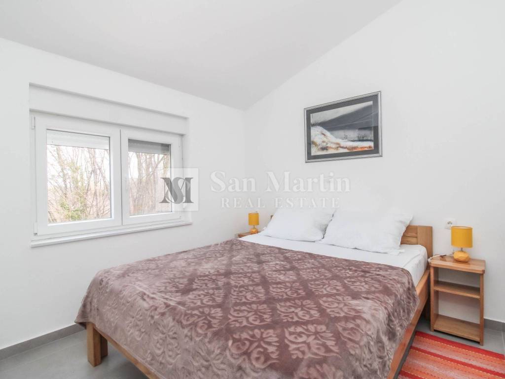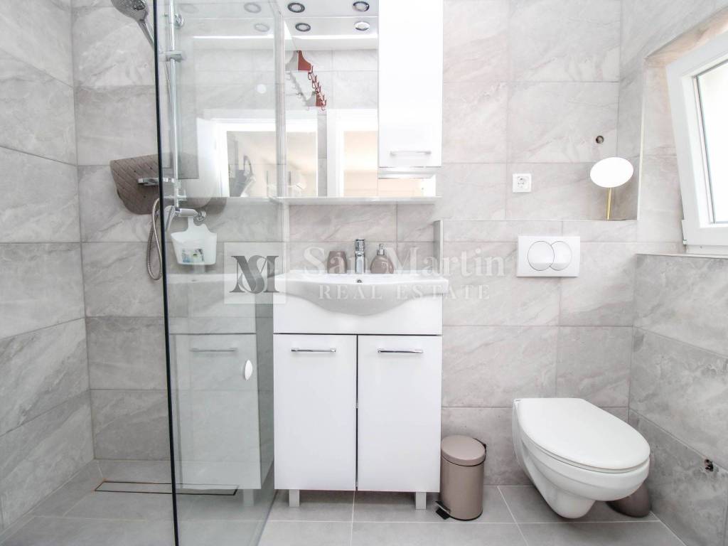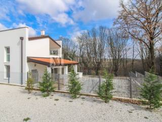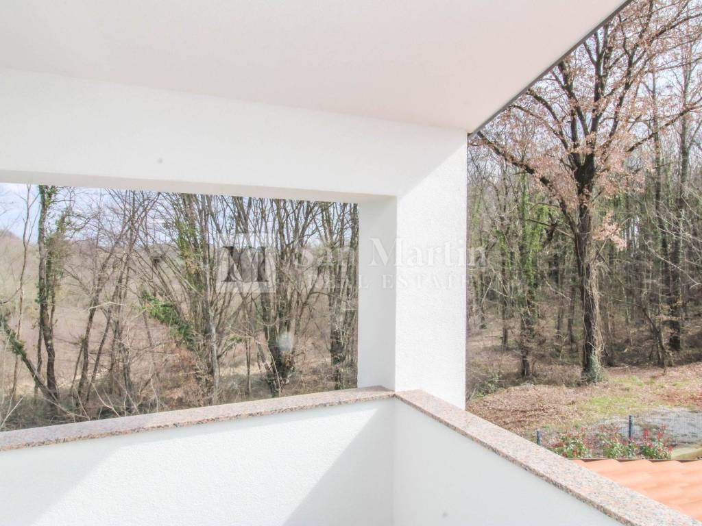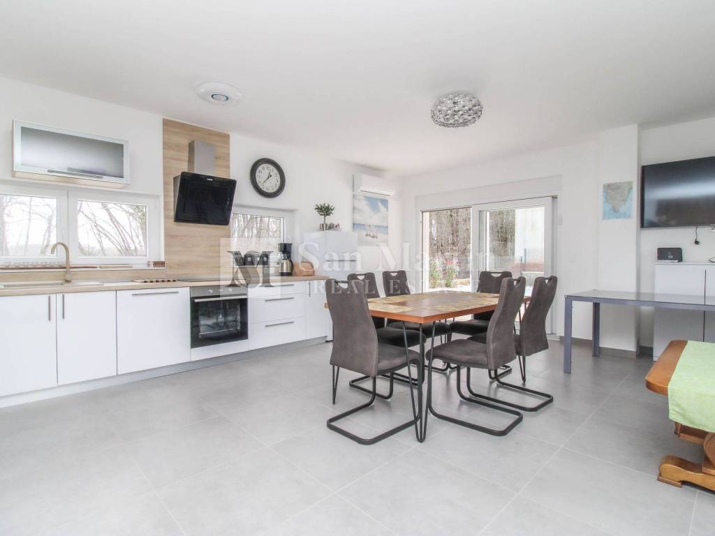 A modern semi-detached house is for sale in the vicinity of Poreč, which is located on a plot of 353 m2 and its total area is 84 m2. The house is spread over two floors. On the ground floor, there is an open-concept living room, kitchen and dining room, as well as a bathroom. there are two bedrooms and one bathroom on the first floor.