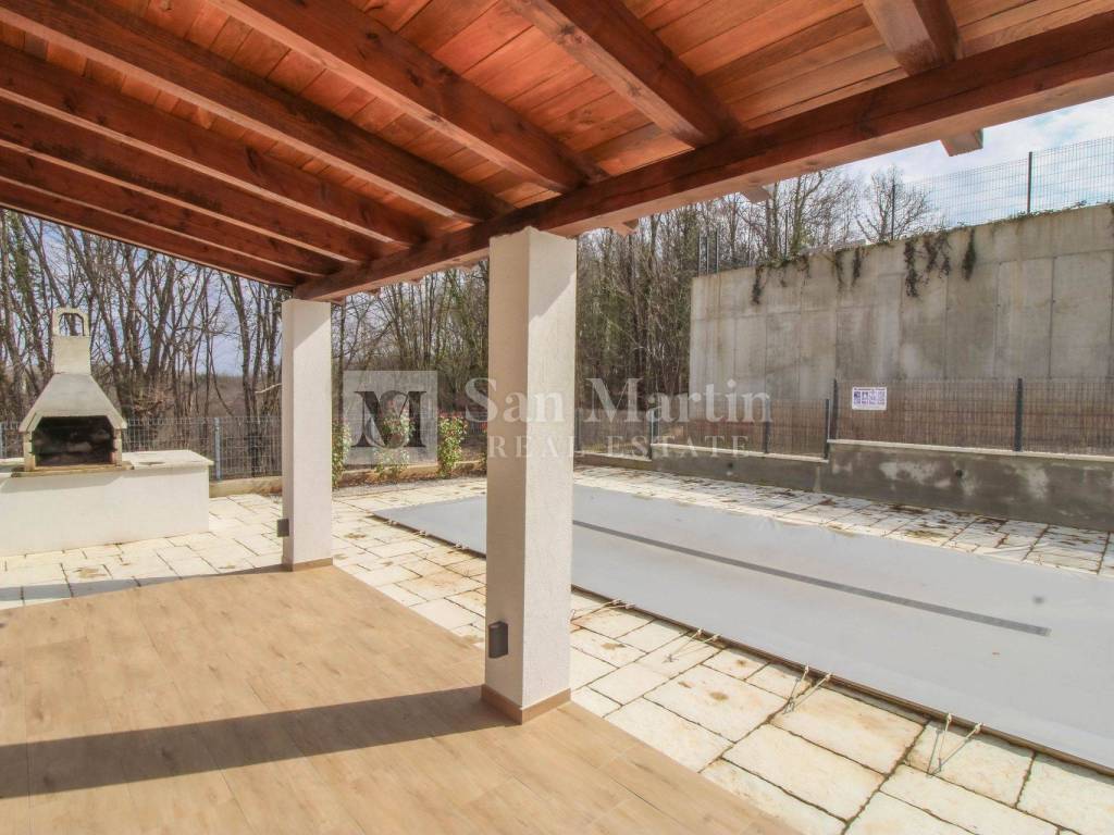The living area of the house leads to a spacious covered terrace and a garden where there is a swimming pool with a sunbathing area and a barbecue.