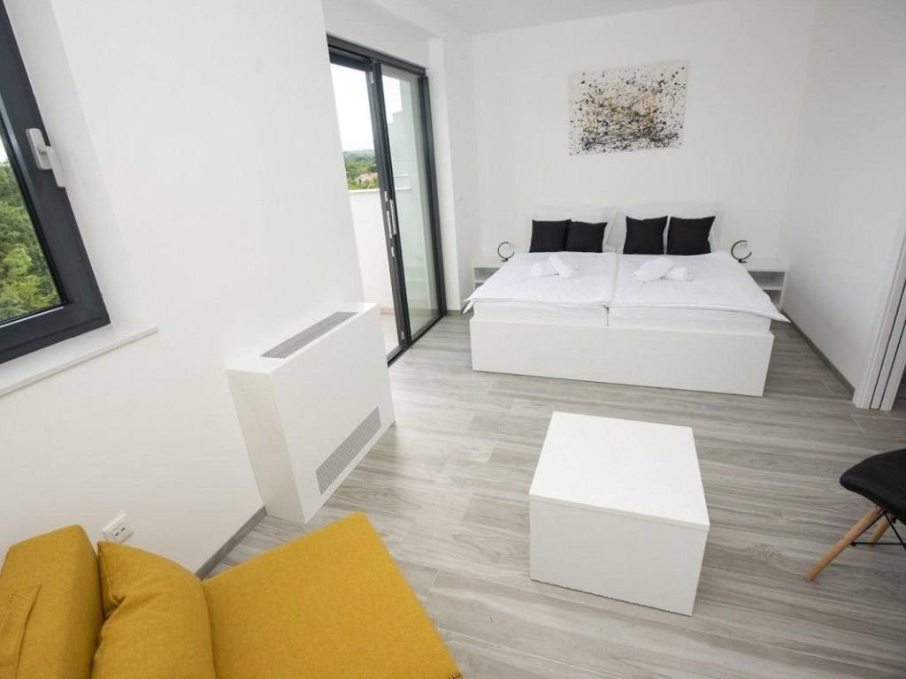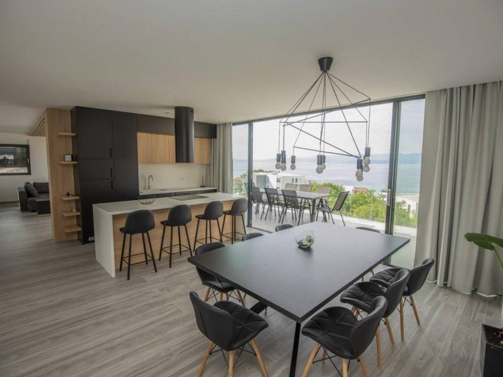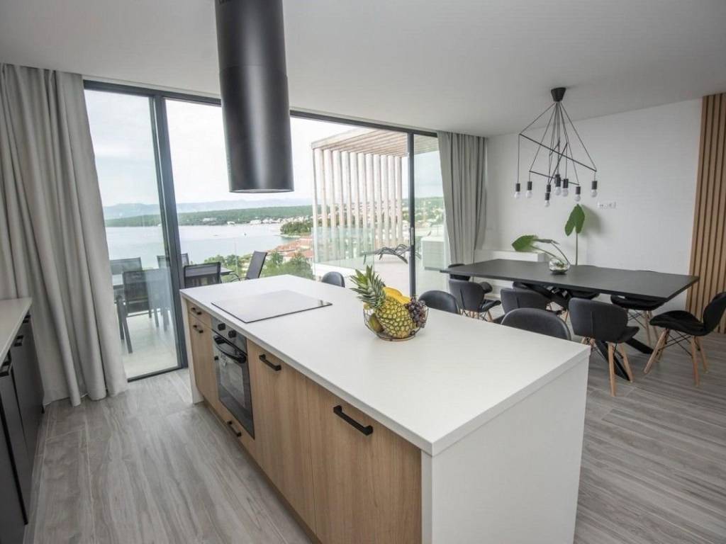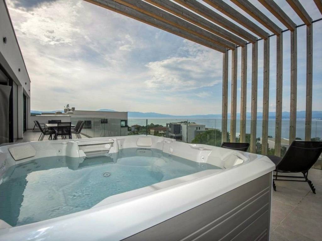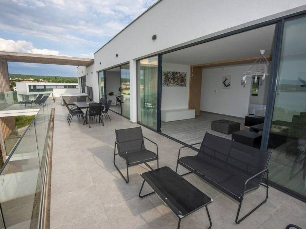 A luxury penthouse with a total area of ​​215 m² is for sale in Malinska, located on the second floor of a low-energy apartment villa, 250 m from the sea.   The penthouse consists of a spacious living room with kitchen and dining room, four bedrooms, three of which have their own bathrooms and covered balconies, additional bathrooms, saunas with showers, staircases and elevators with direct access.   The living room opens onto a covered terrace of 53 m², where there is a jacuzzi, with an open view of the sea. The property comes with two parking spaces of a total area, and a storage room in the basement.   The penthouse is built and equipped with high-quality materials, including a system of sliding facade panel awnings that provide protection from the sun without disturbing the view of the sea, a heating and cooling system, a security system and video surveillance.   The property is located in an elite part of Malinska, near well-maintained beaches and all necessary amenities.