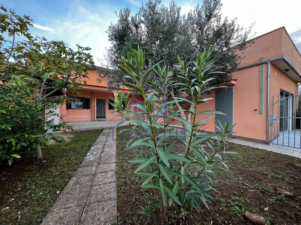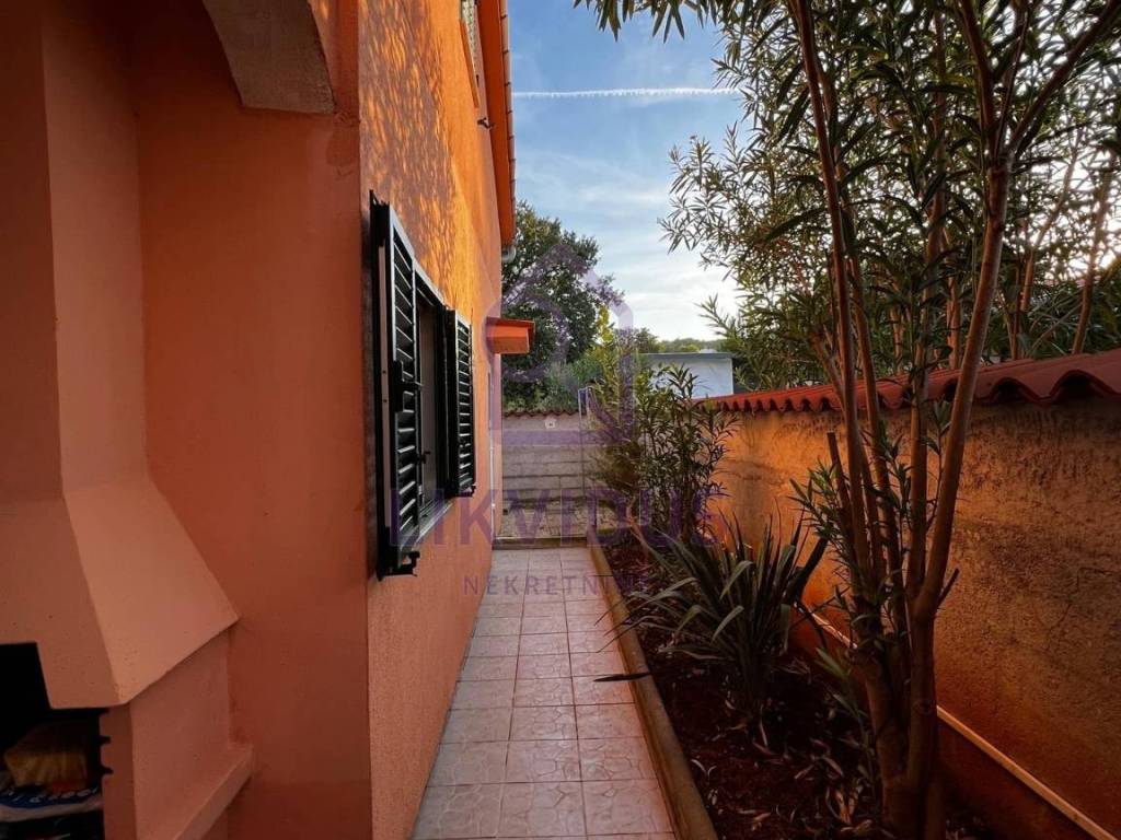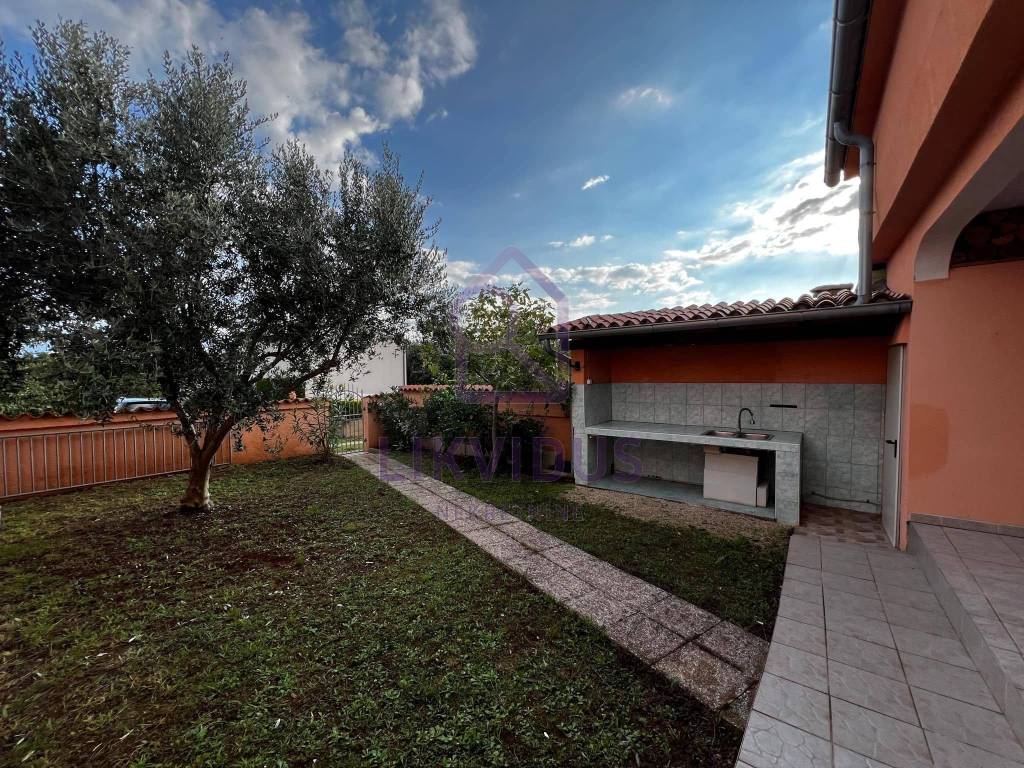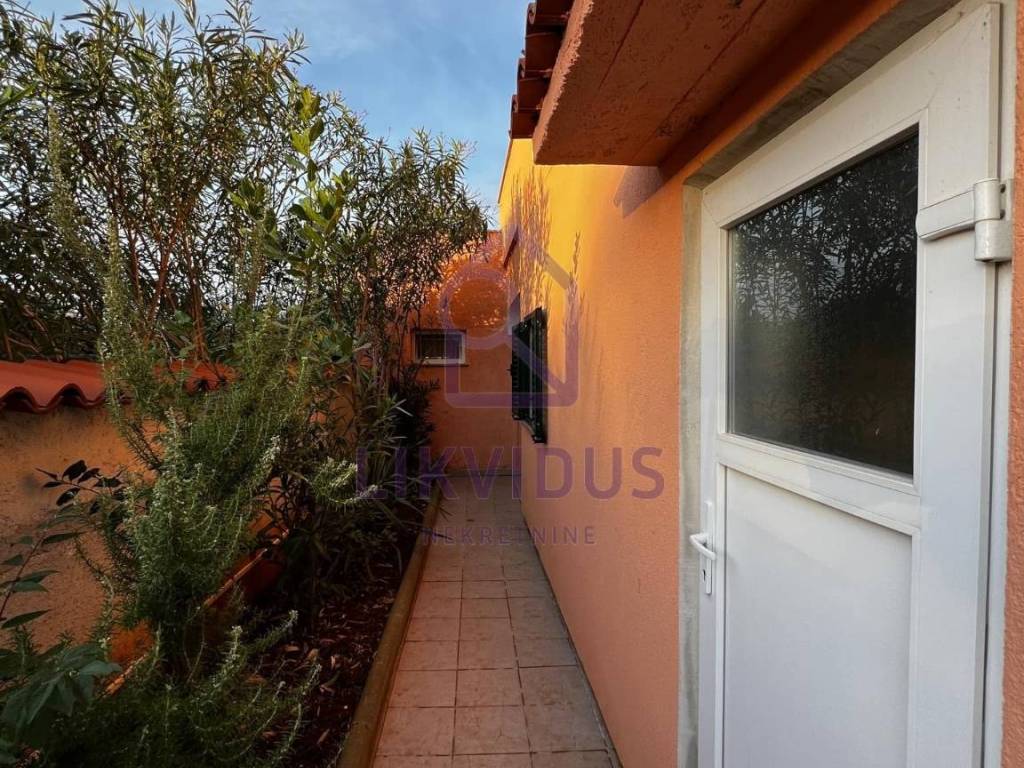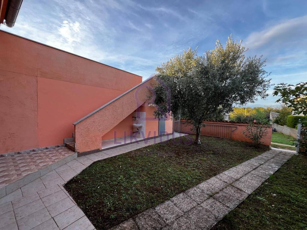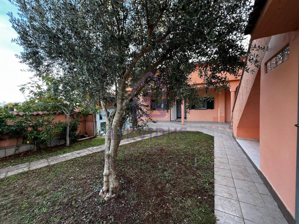 U dvorištu se nalazi zelena uređena površina sa ukrasnim cvijećem (oleanderi, masline, limuni), sa vanjskom kuhinjom, vanjskim kamionom i vanjskim wc-om. Sa desne strane kuće nalazi se i velika garaža sa dodatnom velikom prostorijom koja može služiti kao spremište. Dvorište je u cijelosti ograđeno.