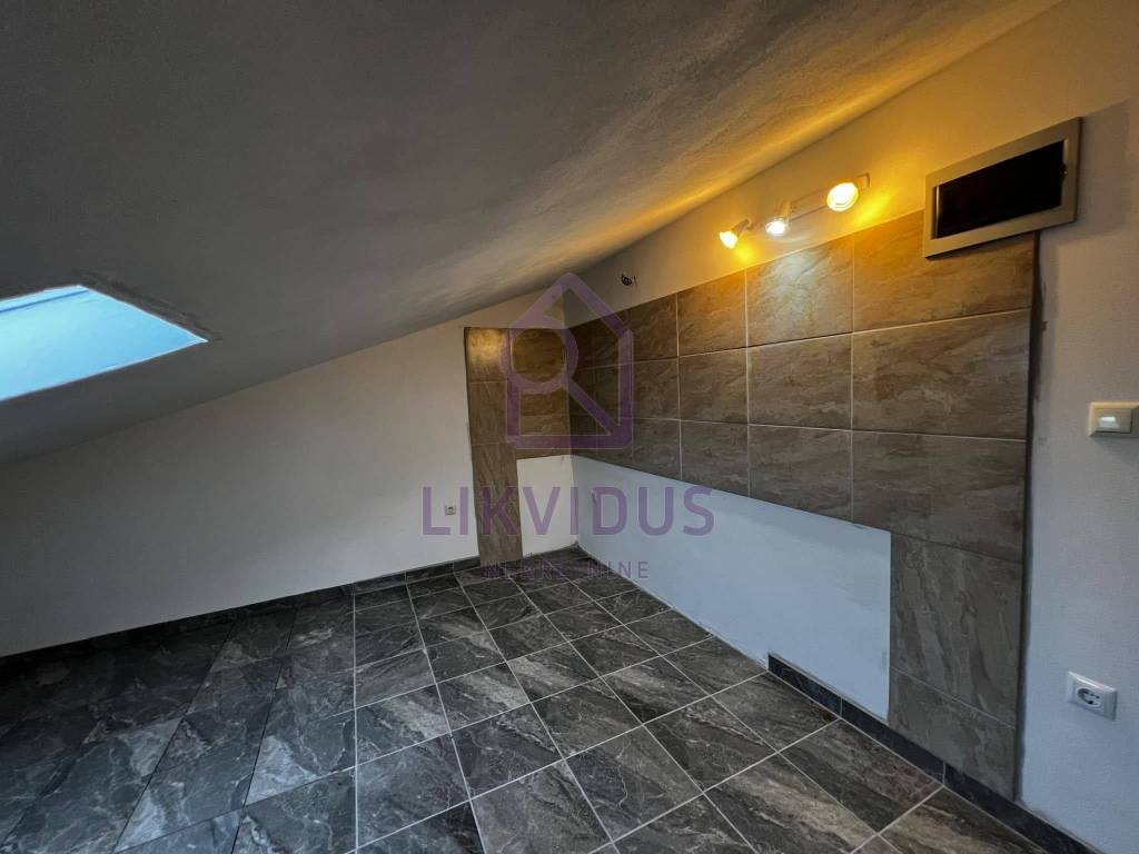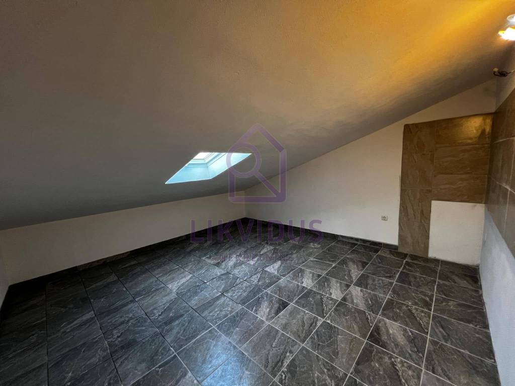 Vanjskim stepenicama dolazi se do velike vanjske terase na prvom katu, iznad garaže. Sa terase se na jednom dijelu u daljini vidi more. Terasom se dolazi do potkrovlja u kojem se nalaze prostorije za dnevni boravak, kuhinju, sobu i kupaonu, međutim taj gornji stan nije u cijelosti dovršen, kako je to i prikazano na priloženim fotografijama. Kuća se prodaje nenamještena.