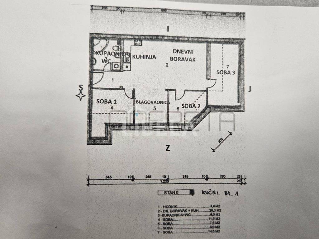 Sastoji se od dnevnog boravka s kuhinjom, blagavaonice, tri spavaće sobe, kupaonice i hodnika. Stanu pripada i spremište od 2 čm u podrumu zgrade.