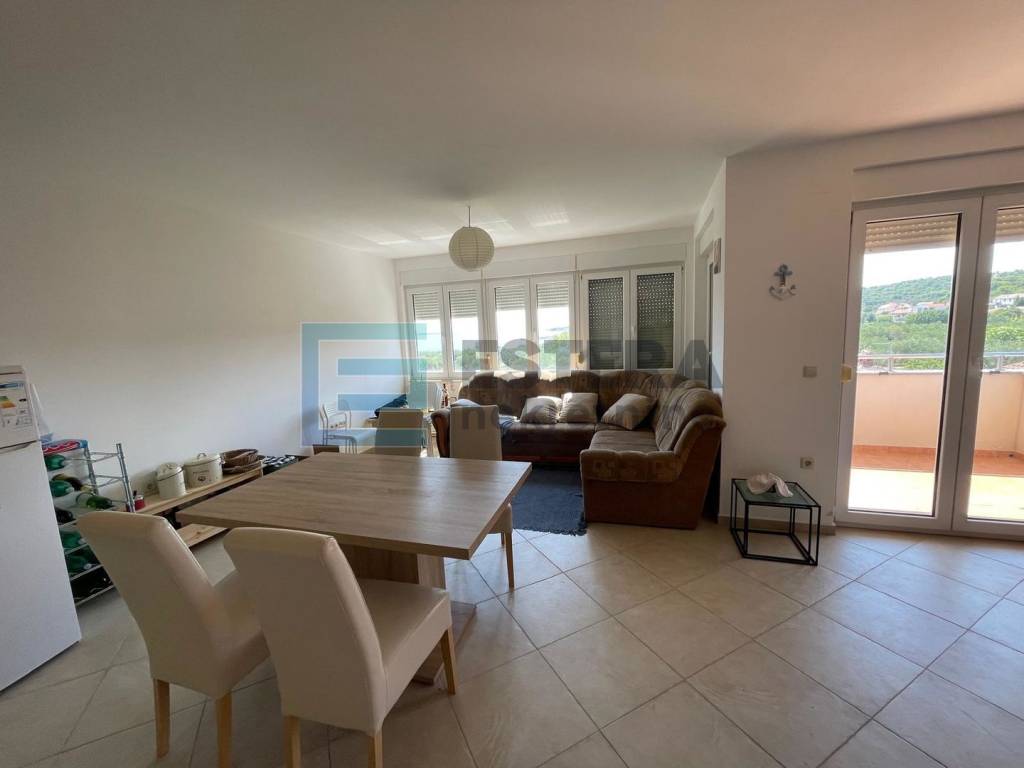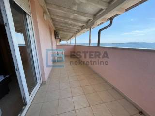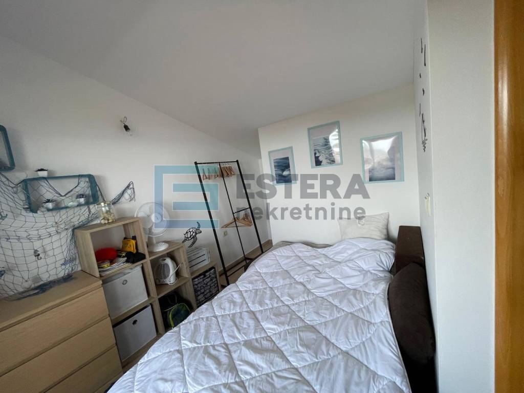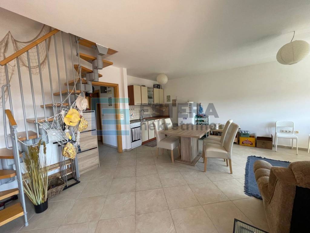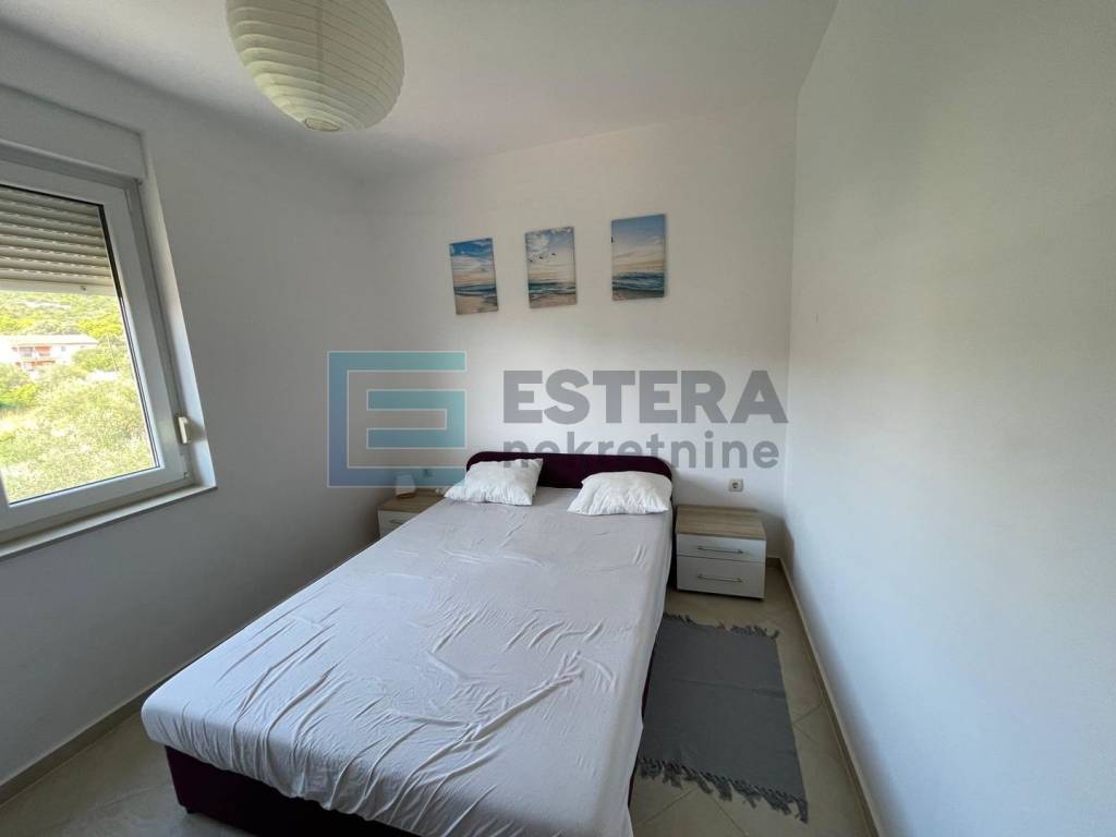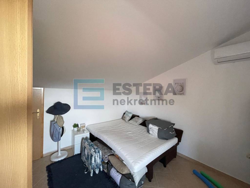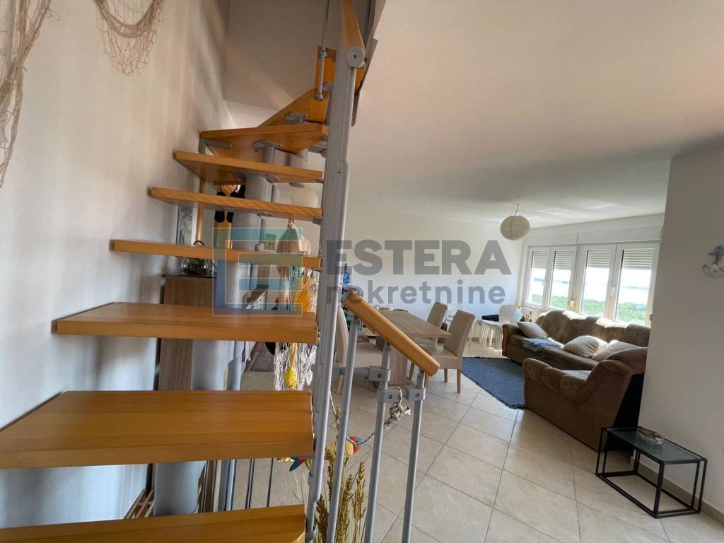 Stan se nalazi na izvrsnoj lokaciji, svega nekoliko minuta hoda od uređene plaže, a već iz dnevnog boravka pruža se otvoren i predivan pogled na more i prirodu. Posebno atraktivan pogled pruža se s lođe, terase i potkrovlja.