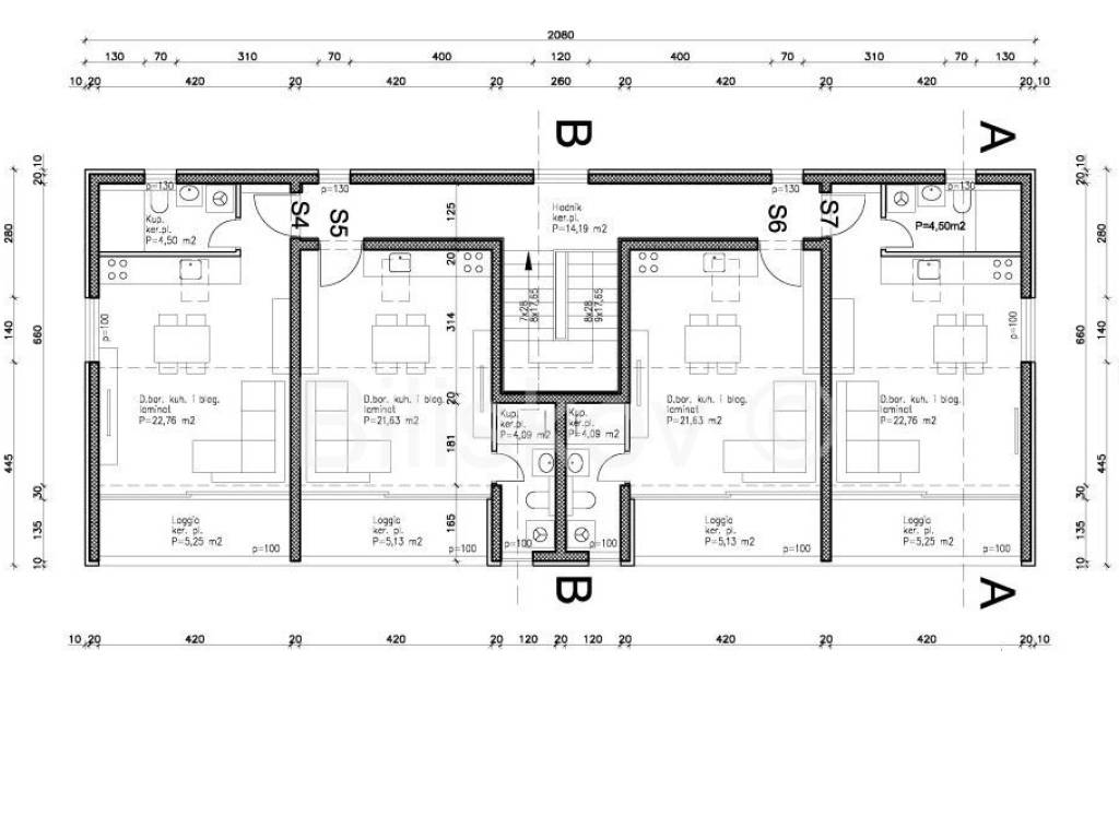 APARTMENT 5: one-bedroom apartment on the 2nd floor, floor area 25.772m2 with a loggia of 5.13m2 and a parking space, total calculated area 42m2.Given the ceiling height of 4.8m2, the apartment will also have a gallery with space for a bedroom. 119,000