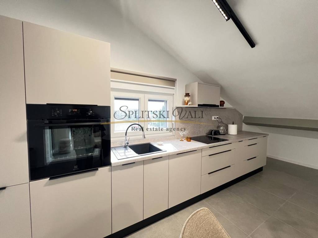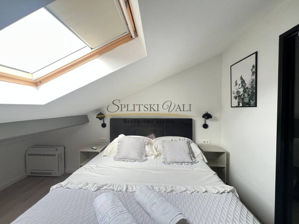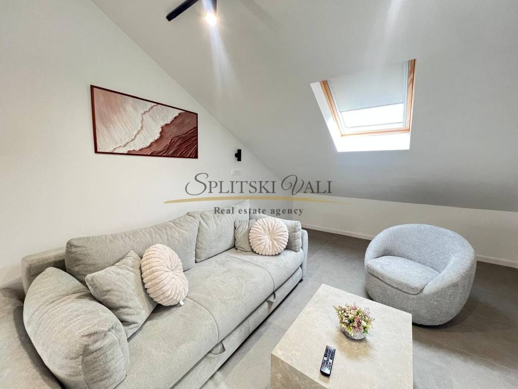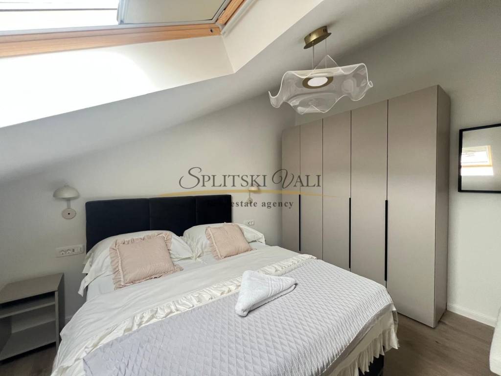 Posredujemo u najmu dvosobnog stana u potkrovlju u Kaštel Starom, uz Staru kaštelansku cestu, u blizini svih sadržaja i autobusne stanice. Stan ima ukupnu stambenu površinu od 90 m te se sastoji od dvije sobe, od kojih jedna ima vlastiti WC, kuhinje s blagovaonicom, hodnika i jedne kupaonice. Stanu pripada i terasa površine 10 m, kao i jedno parkirno mjesto.