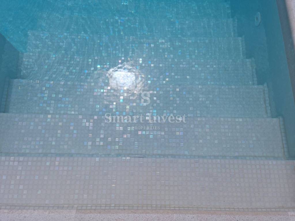 The spacious garden is dominated by a 12 x 5 meter swimming pool with a massage bench, lined with glass mosaic tiles, and surrounded by a landscaped sunbathing area of as much as 170 m, paved with non-slip white ceramic tiles. Next to the pool is a covered terrace with prepared electricity and water installations, ideal for a future summer kitchen and outdoor gatherings. Several parking spaces are provided within the property, which is entirely enclosed by dry stone walls.
