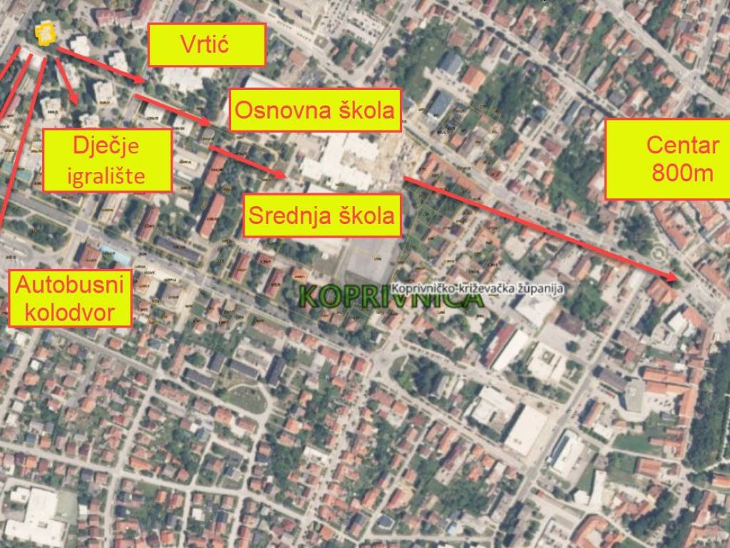 В продаже трёхкомнатная квартира для долгосрочной аренды в Копривнице, расположенная на 3 этаже жилого дома с недавно обновлённым термофасадом. Здание находится на улице Трг краља Томислава, в благоустроенном комплексе из восьми жилых домов.