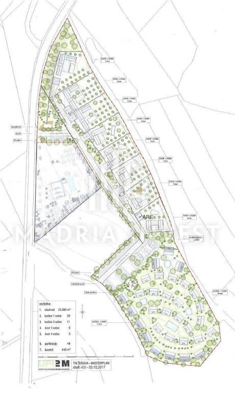 Zemljište nedaleko od Zadra, površine 25 330 m2 sa razrađenim projektom za izgradnju Village Resorta u stilu starog dalmatinskog sela. Zemljište se nalazi na periferiji grada Zadra, uz samu cestu Zadar-Ražanac. Projekt je zamišljen kao eko selo u kojem bi gosti uživali u tradicionalnim bogastvima i arhitekturi tipičnoj za ovo podneblje, a istovremeno imali dostupne sve moderne sadržaje koji boravak čine ugodnim. Villa Resort bi mogao smjestiti 158 ljudi, raspoređenih u 40 smještajnih jedinica različitih veličina. Predlažu se dvije vrste smještajnih jedinica: