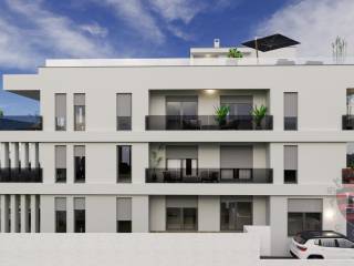 The construction of a new residential building, rectangular in shape, consisting of a ground floor and two floors, is planned. There are six outdoor parking spaces on the northeast side, while pedestrian and vehicular access are located on the southwest side.
