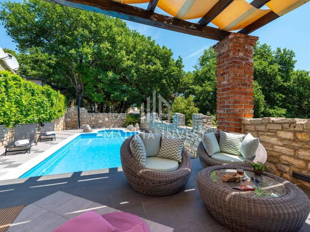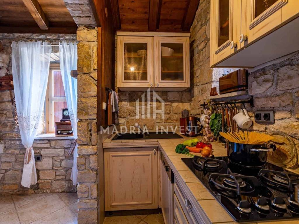 An additional one-room apartment is located on the second floor. The entire villa, as well as the associated stone house, were built in the Mediterranean style. The 100 m2 stone house has a kitchen, dining room and living room. The two bedrooms located in this building also come with bathrooms and an additional toilet. This entire luxury apartment villa is surrounded by greenery, but to make things even more interesting, it also has its own wine cellar. Enjoying the pool in the evening with a glass of wine right at hand is the perfect combination, and that's why this villa sells out immediately with the first appearance of warmer weather and the first signs of summer. The sea is 50 meters away and there are 6 parking spaces.