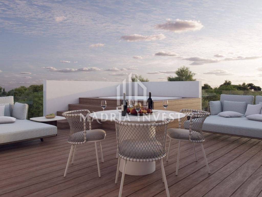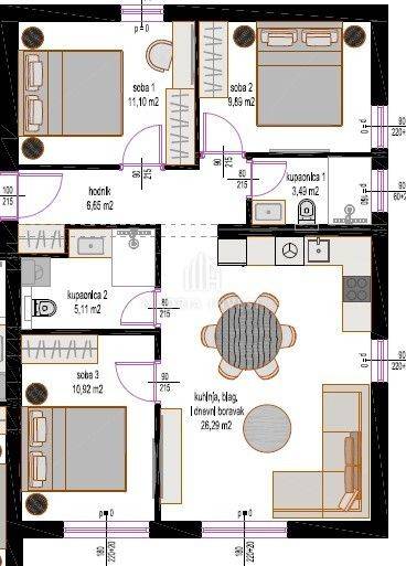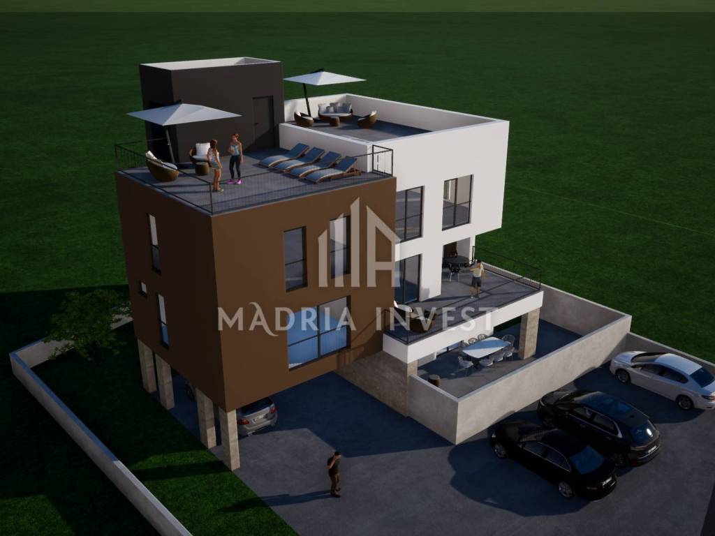 Three-room apartment with roof terrace. The apartment is on the 2nd floor and has a roof terrace. The apartment consists of: - hallway - bedroom 1 - bedroom 2 - bedroom 3 - bathroom - bathroom - kitchen/dining room and living room The apartment has a roof terrace of 76 m2 and two parking spaces. The customer has the option of choosing ceramics, parquet and room doors. The planned construction completion date is the end of 2025.