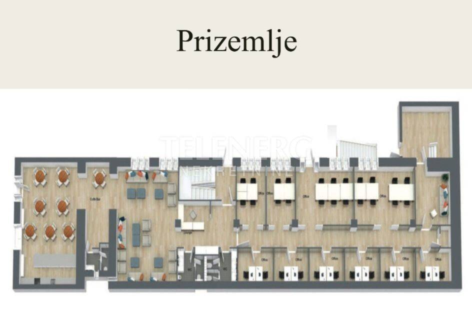 Prostor površine 200 m2 se nalazi u prizemlju, a sastoji se od 10 ureda i 2 sanitarna čvora.