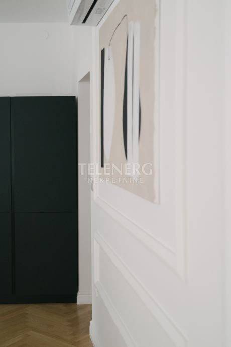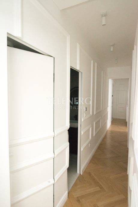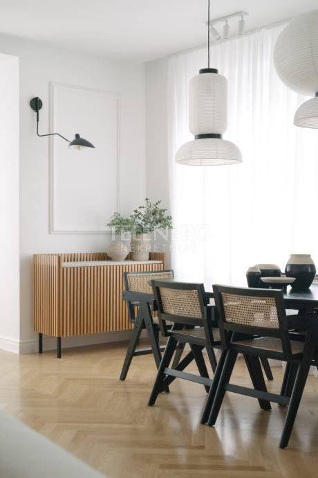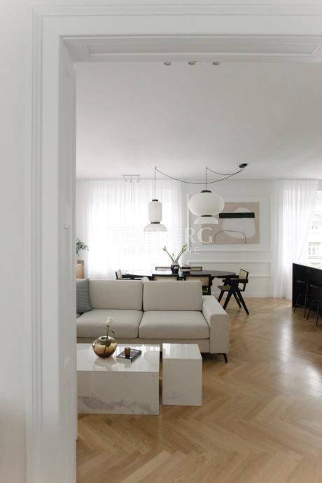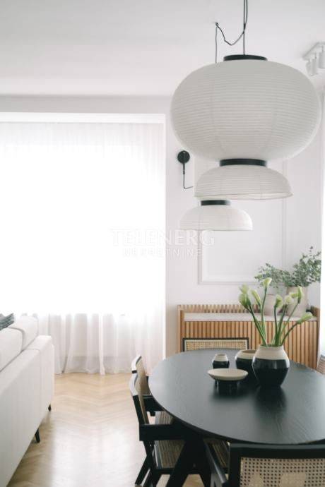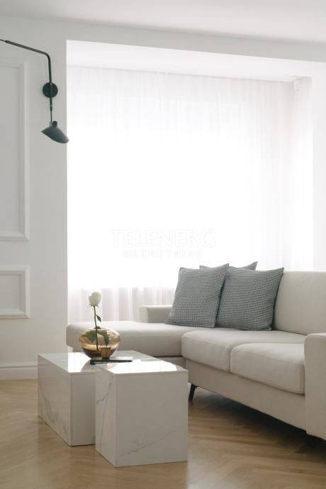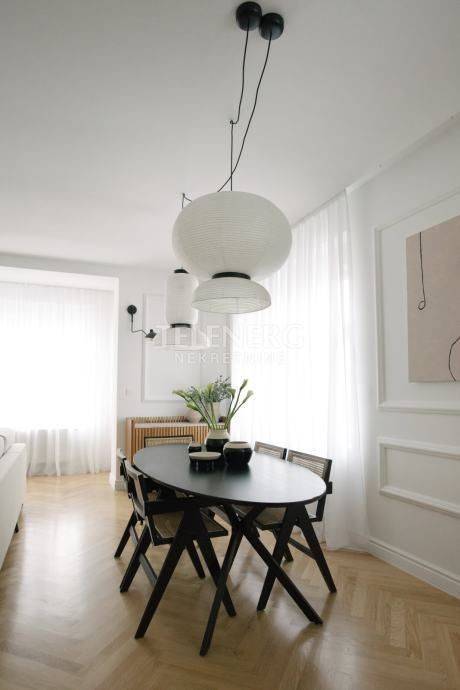 The apartment was thoroughly and qualitatively renovated in 2022 and completed at the beginning of 2023 - all installations (electricity, water, gas), additional insulation on the external walls, PVC exterior joinery, massive parquet, 1st class tiles, renovated antique doors , the kitchen has a very popular large-format porcelain tile as a worktop, designer lighting fixtures as well as the furniture itself. The antique doors have been restored to a high standard, and the other doors are very modern filomurro doors that look like part of the wall when closed.
