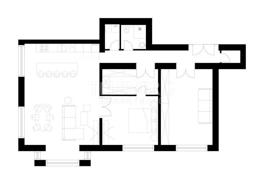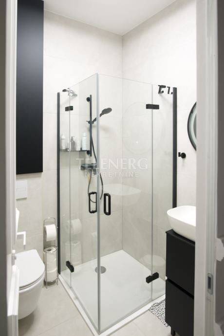 The apartment consists of an entrance hall, a kitchen/dining room/living room designed as an open space, and two large rooms. The master bedroom has a large walk-in closet with floor-to-ceiling custom cabinets. Bathroom equipped with shower and toilet. Three air conditioning units cover the apartment, as well as the gas central heating system. The bathroom has underfloor heating. In addition to the master's room, there is also an additional small storage room right next to the front door.