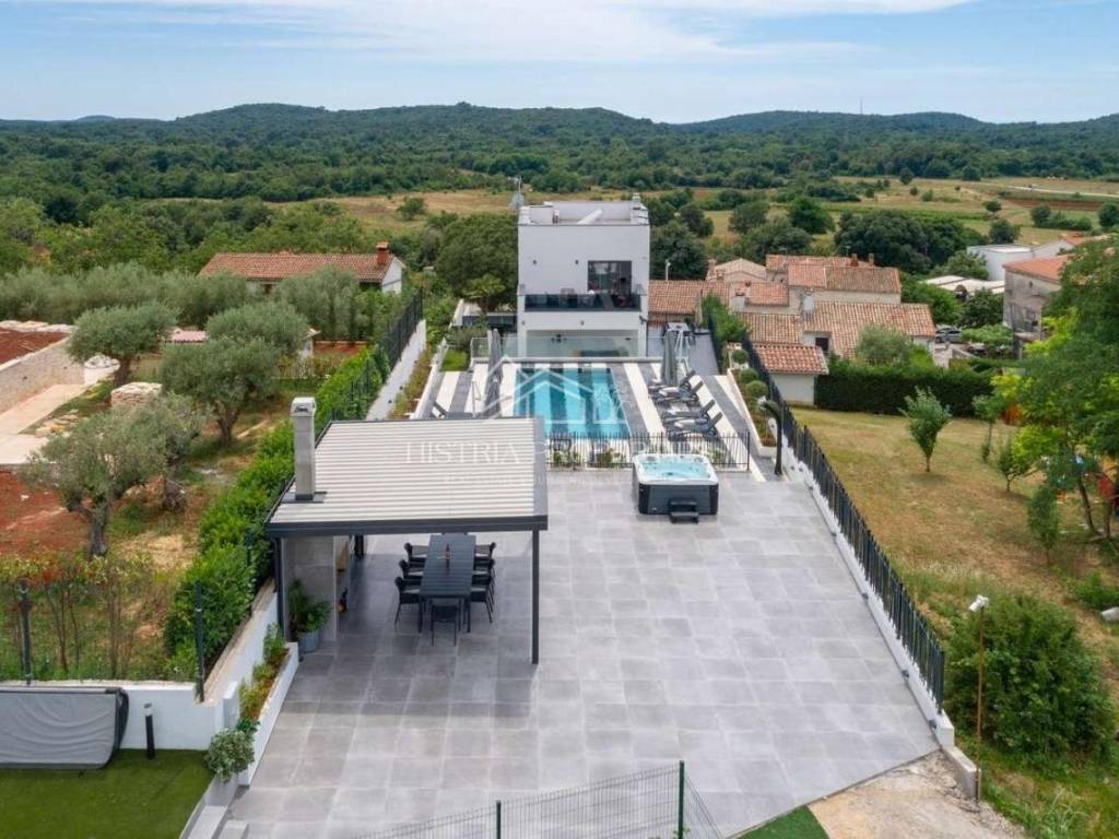 Not far from the beautiful Istrian town of Vrsar, this contemporary villa with modern architecture with a tennis court and a heated swimming pool is for sale.