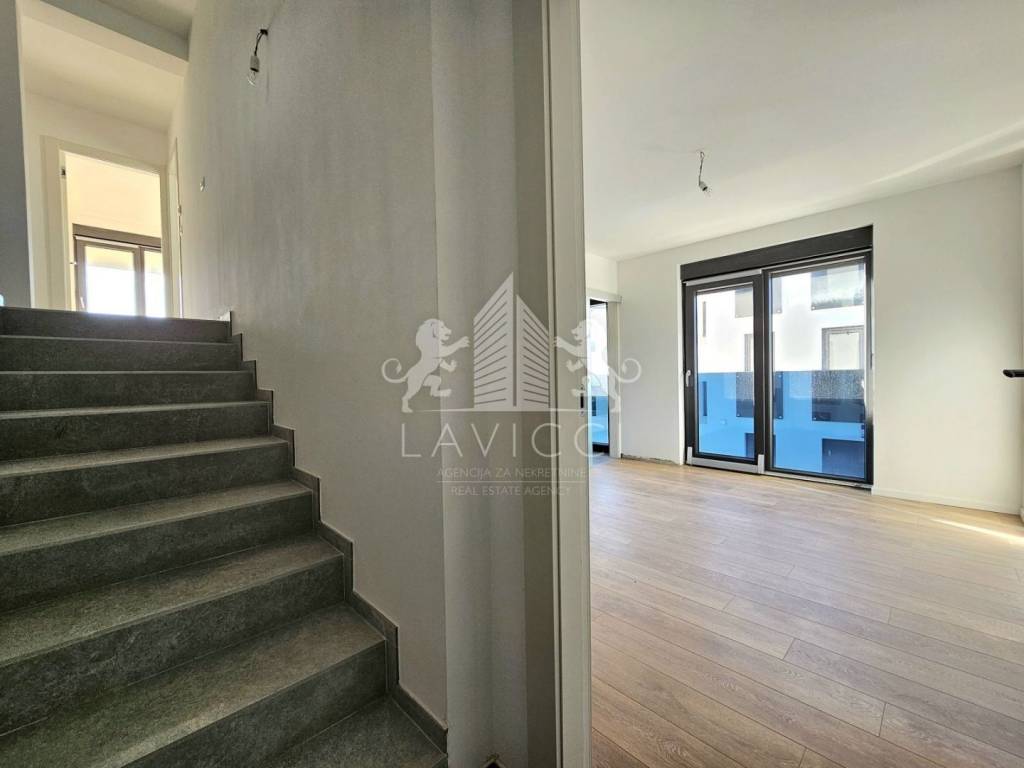 The apartment is equipped with a multi-split system of air conditioners for heating and cooling, which will be installed in the bedrooms and the living room, as well as PVC joinery with mosquito nets and blinds. There is a possibility of installing a chimney or a wood stove. The floors are covered with ceramics in the living area and bathrooms, while high-quality laminate is installed in the rooms. The building is insulated with a thickness of 10 cm, as well as the insulation of the staircase, which contributes to the energy efficiency of the apartment.