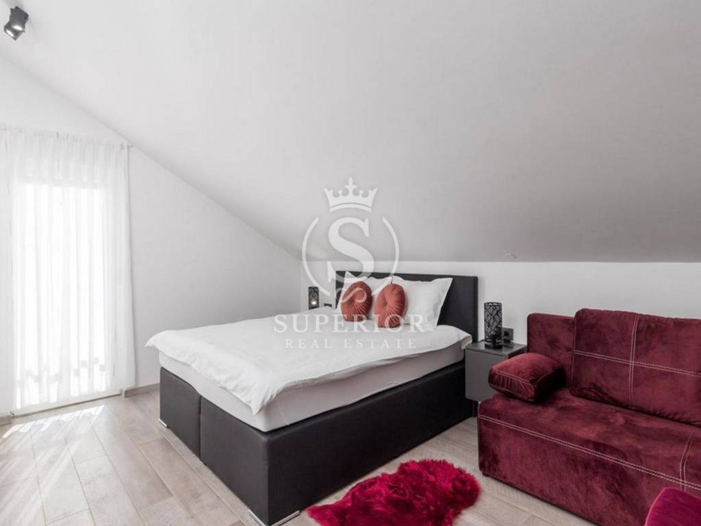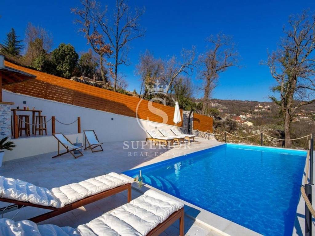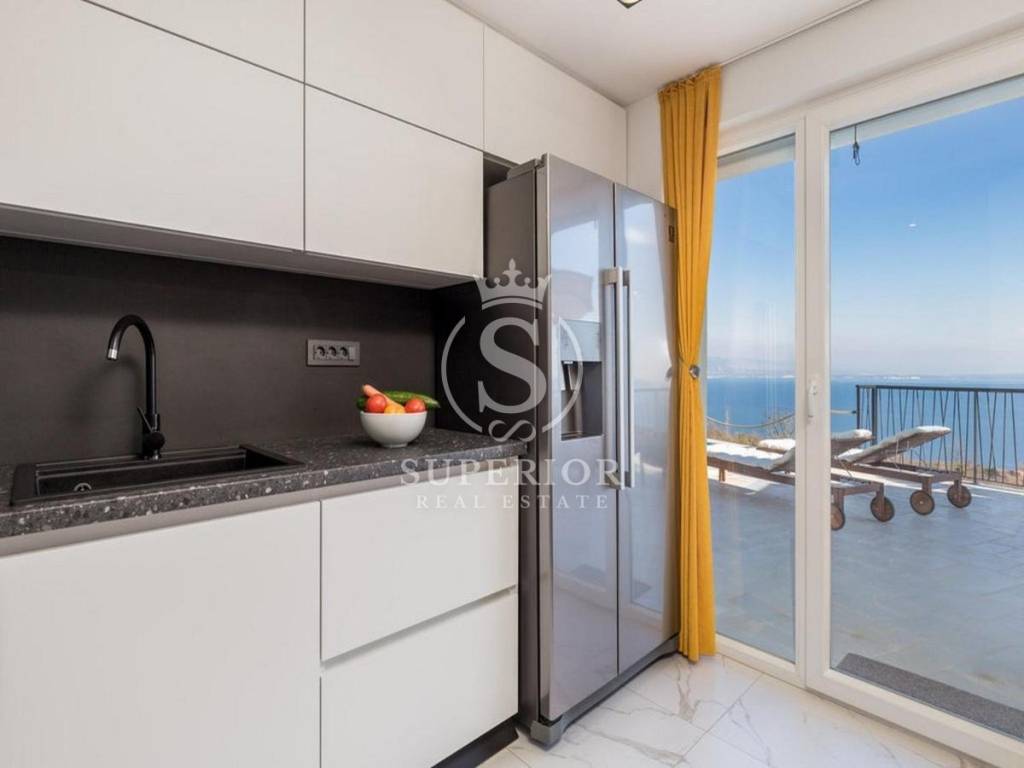 Located in the tranquil hills of Poljane, just a few minutes above the coast, this modern detached villa blends striking architecture, luxurious amenities, and breathtaking views over the Kvarner Bay.