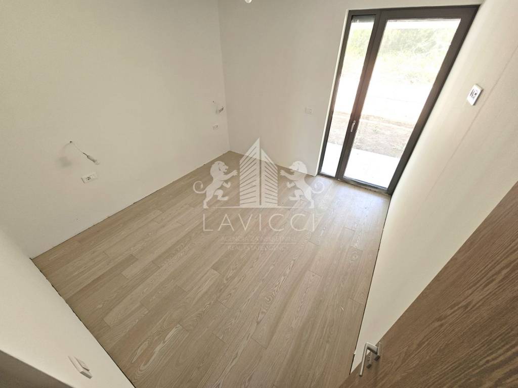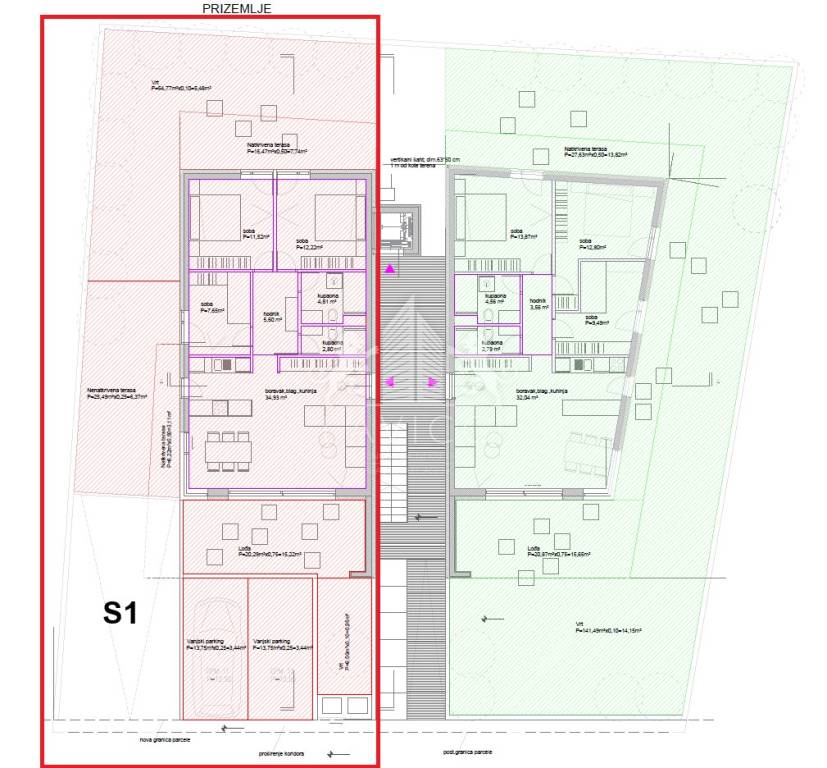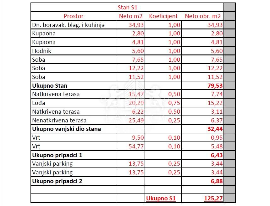 The apartment marked S1, with a total living area of 79.53 m2, consists of a living area with a kitchen, dining room and living room, three bedrooms and two bathrooms with a toilet. The apartment also has a 20 m2 loggia and a 32 m2 terrace that can be accessed from the living area. The rooms lead to a covered terrace of 15 m2 and a garden of 64 m2. The apartment has two outdoor parking spaces. Heating and cooling is provided by a modern inverter multi-split system in all rooms. The floor coverings are a combination of three-layer parquet and high-quality ceramic tiles. High energy efficiency is contributed by the 10 cm thick polystyrene facade, while the external staircase is covered with stone wool. PVC joinery with mosquito nets and ALU roller shutters with electric lifts have been installed. Anti-burglary and fire doors have been installed, which contribute to the safety of future tenants.