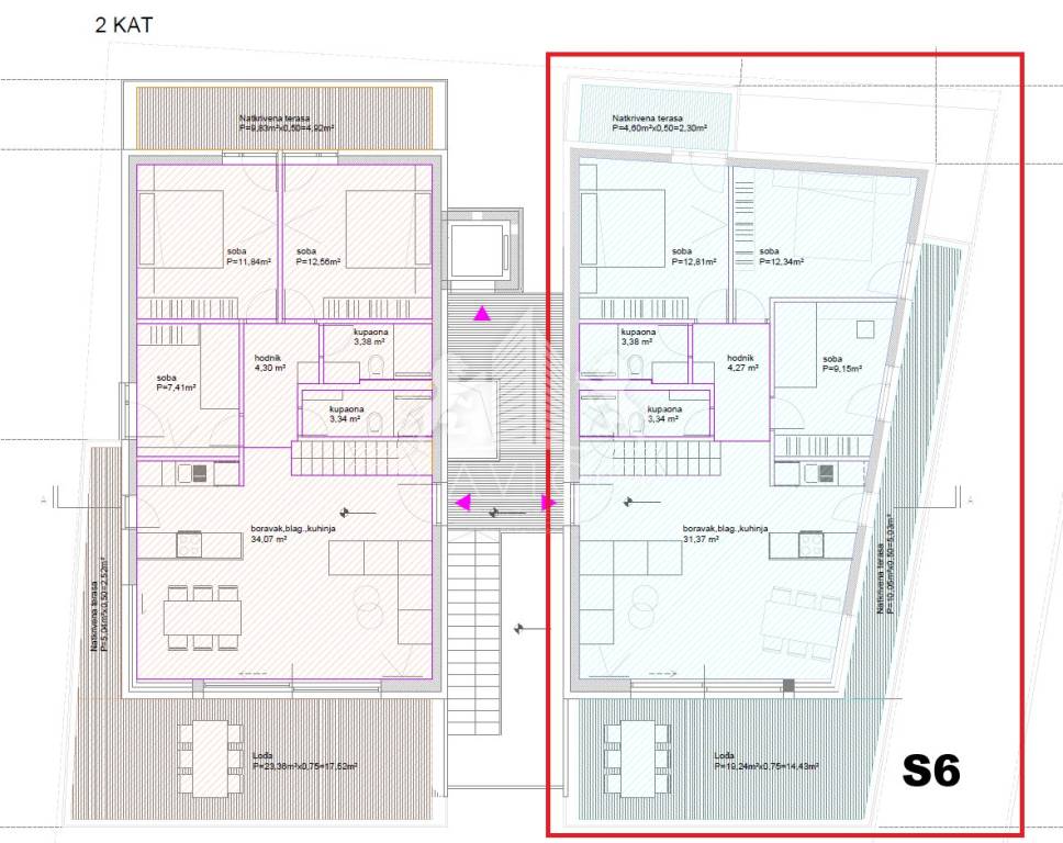 Apartment marked S6, with a total living area of 82.25 m2, consists of a living room with a kitchen, dining room and living room, three bedrooms and two bathrooms with a toilet. The apartment also has a loggia of 19 m2 and a terrace of 10 m2, accessed from the living room. The rooms open onto a covered terrace of 5 m2.