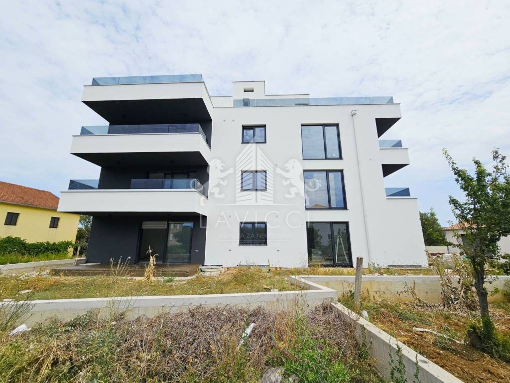 The building consists of 4 floors (ground floor + first floor + 2), and all floors will be connected by an elevator (from the basement to the roof). On the ground floor there are apartments with Mediterranean gardens, on the first floor there are 2 apartments with covered terraces, and on the second floor there are two penthouse apartments with roof terraces from which there is a beautiful panoramic view of the sea and the Zadar archipelago.