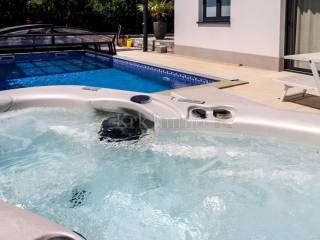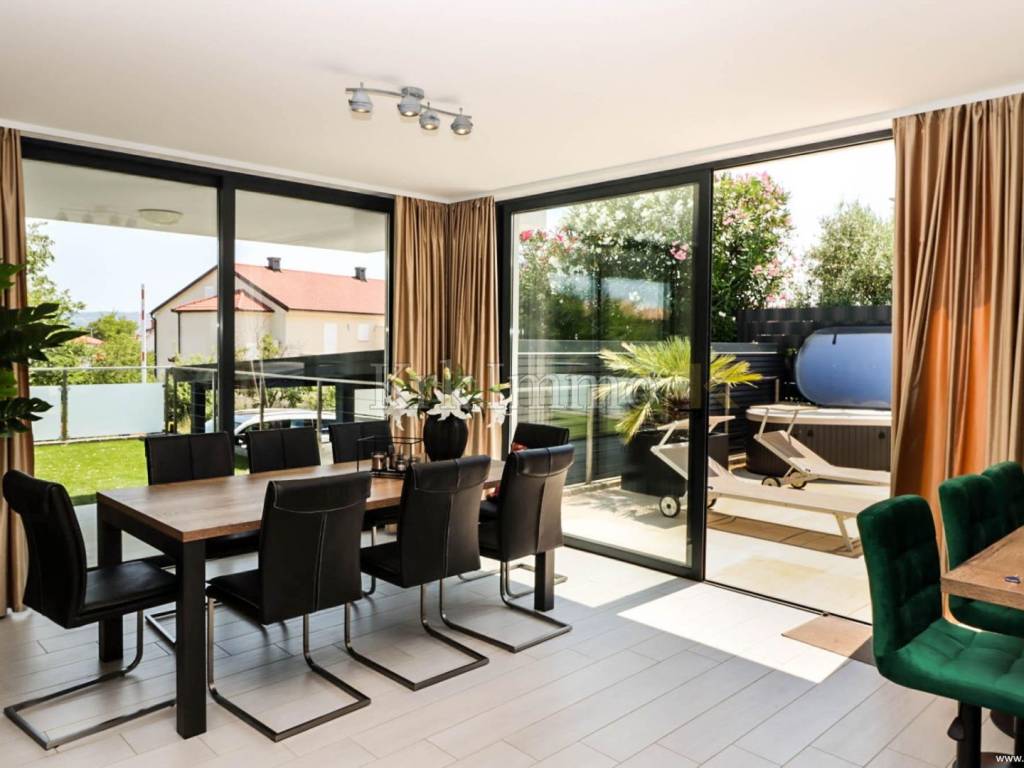 The landscaped garden contains a covered swimming pool of 32 m2, a jacuzzi, a sun deck, an outdoor shower, an outdoor storage room and a covered parking space. The apartment is equipped with multisplit air conditioners in all rooms, high-quality PVC carpentry, underfloor heating, high-quality floor coverings, glass walls that allow a lot of natural light, and high-quality sanitary ware and ceramics. It is for sale fully furnished and equipped, and is ready for occupancy.