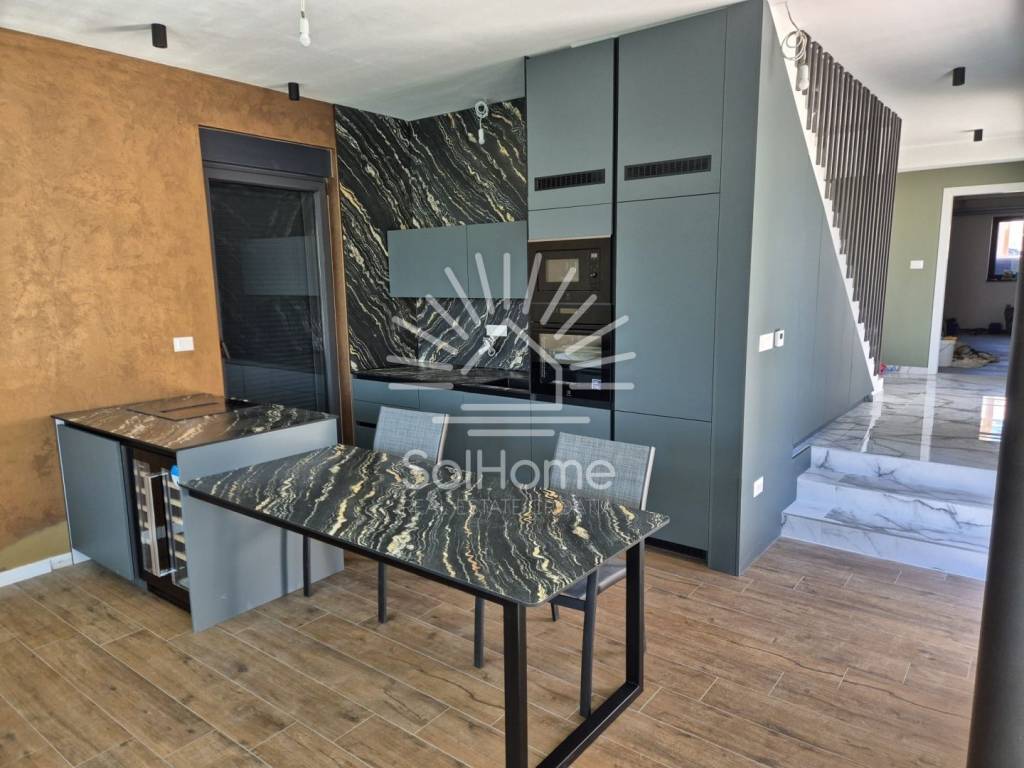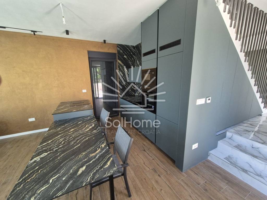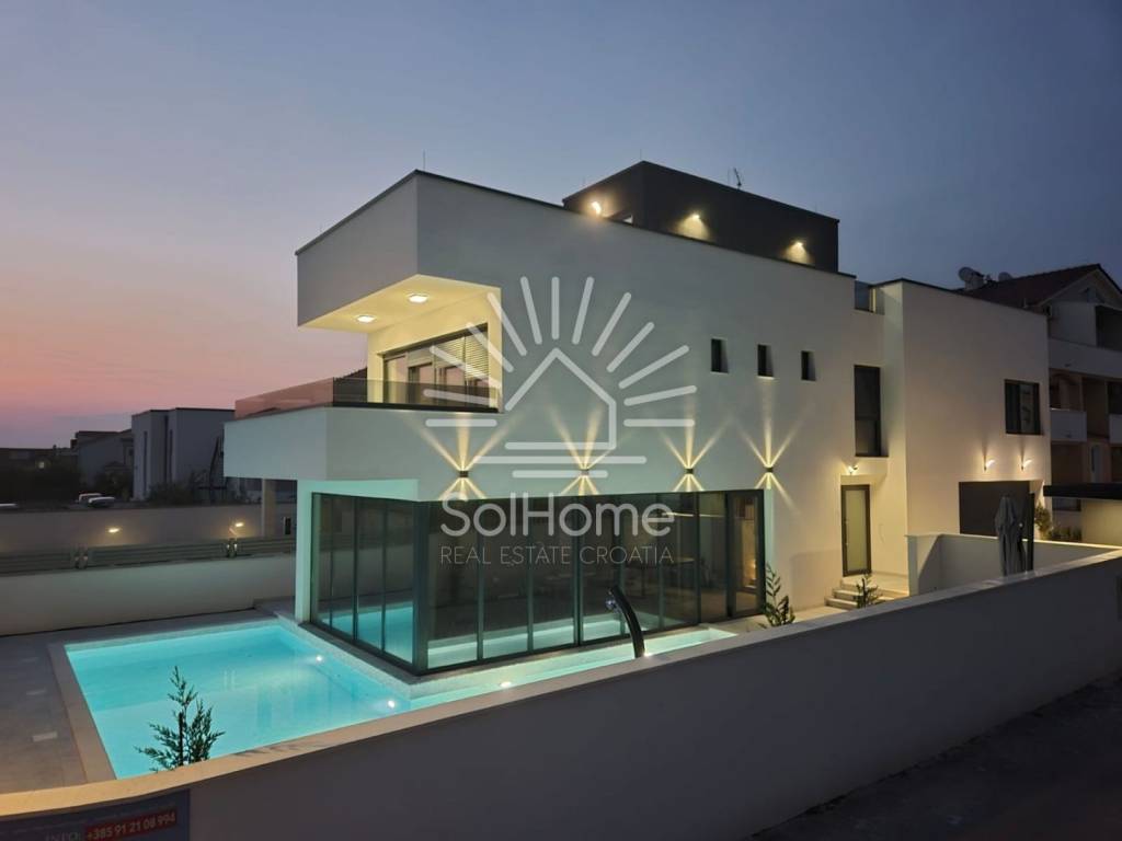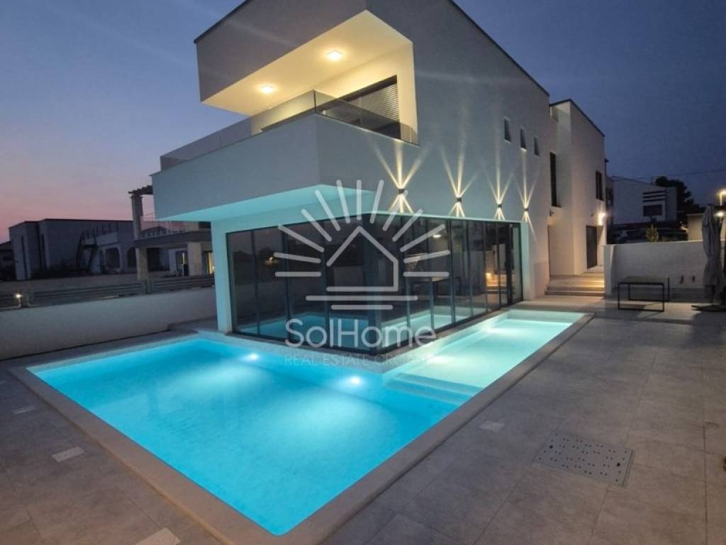A beautiful modern house near Zadar is for sale. It features a highly functional layout with a ground floor, first floor, and a rooftop terrace.