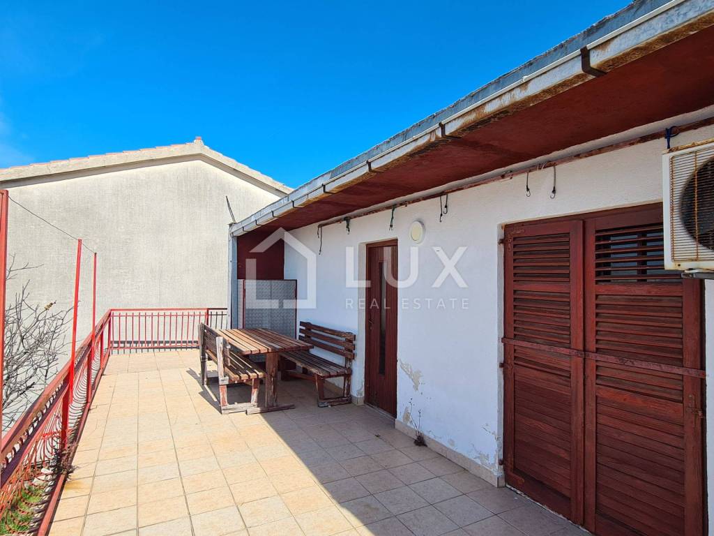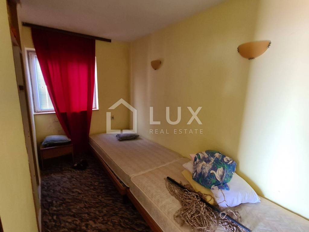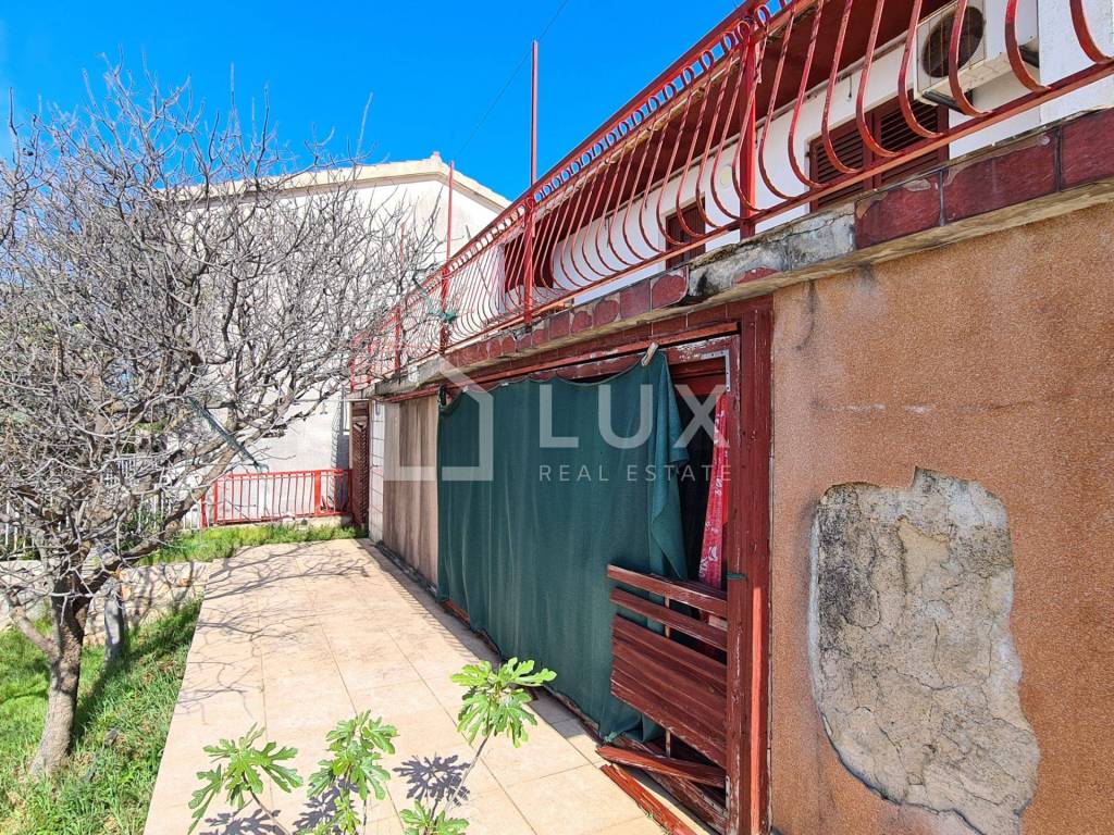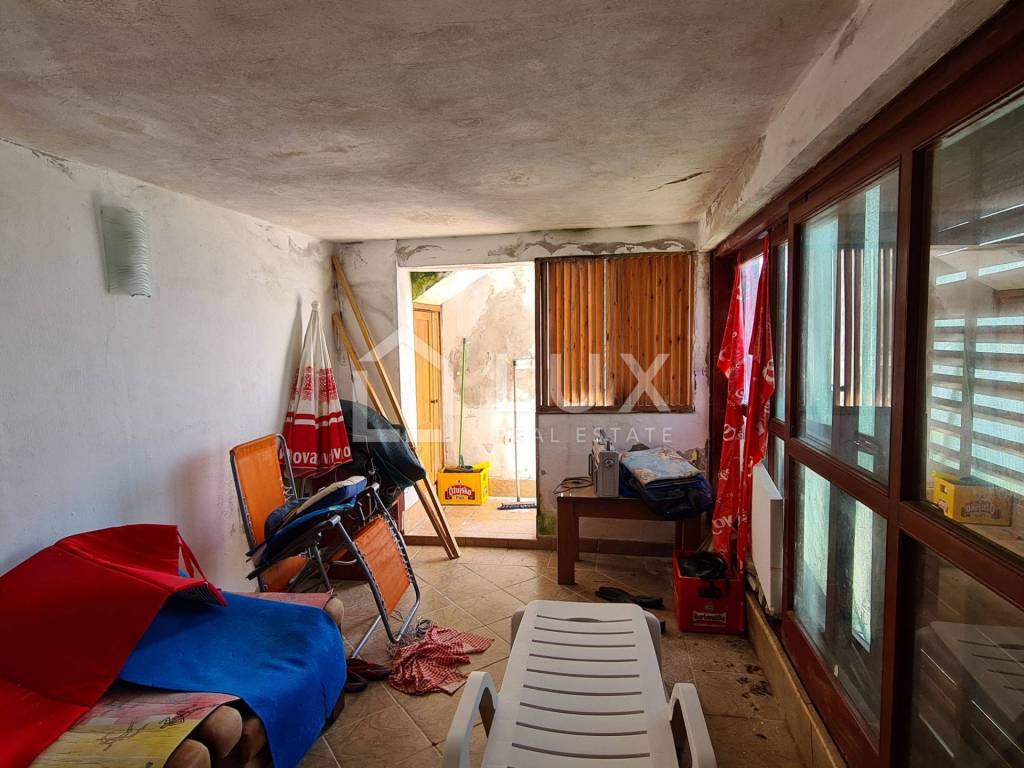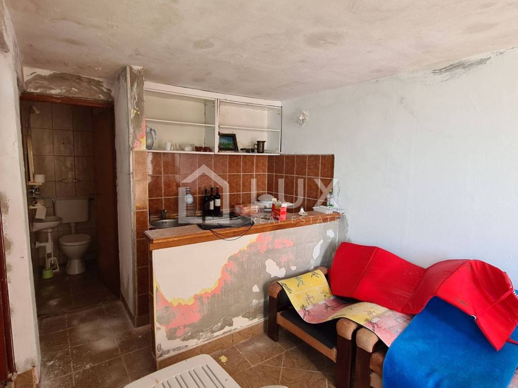 The residential part of the house covers 104m2: - the ground floor of 27m2 is currently a space for socializing with a bathroom, a - the first floor is a 77m2 apartment consisting of an entrance hall, kitchen, living room, 2 bedrooms and a bathroom, with a terrace with an open view of the sea and the islands.