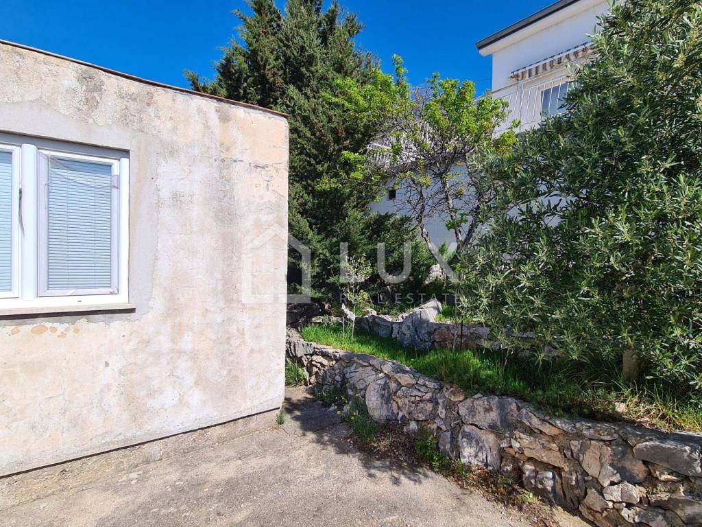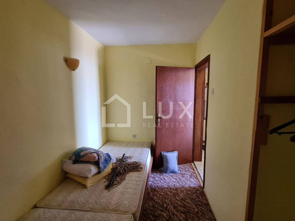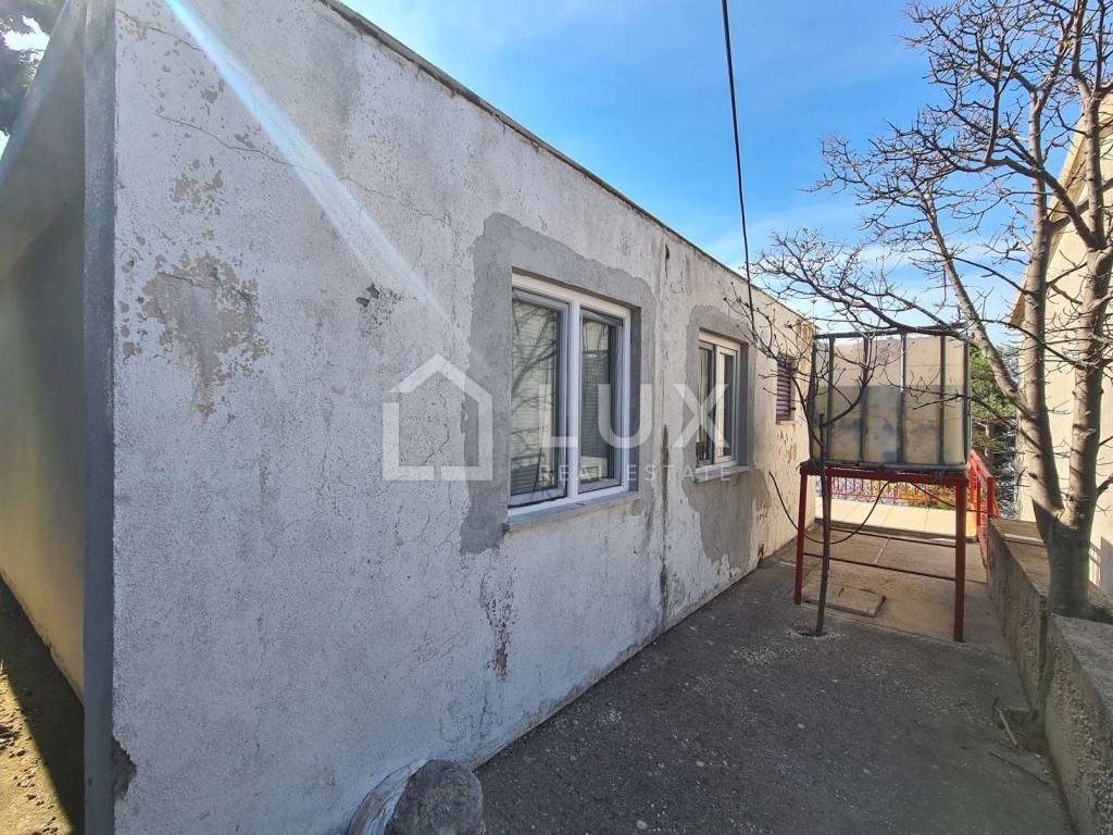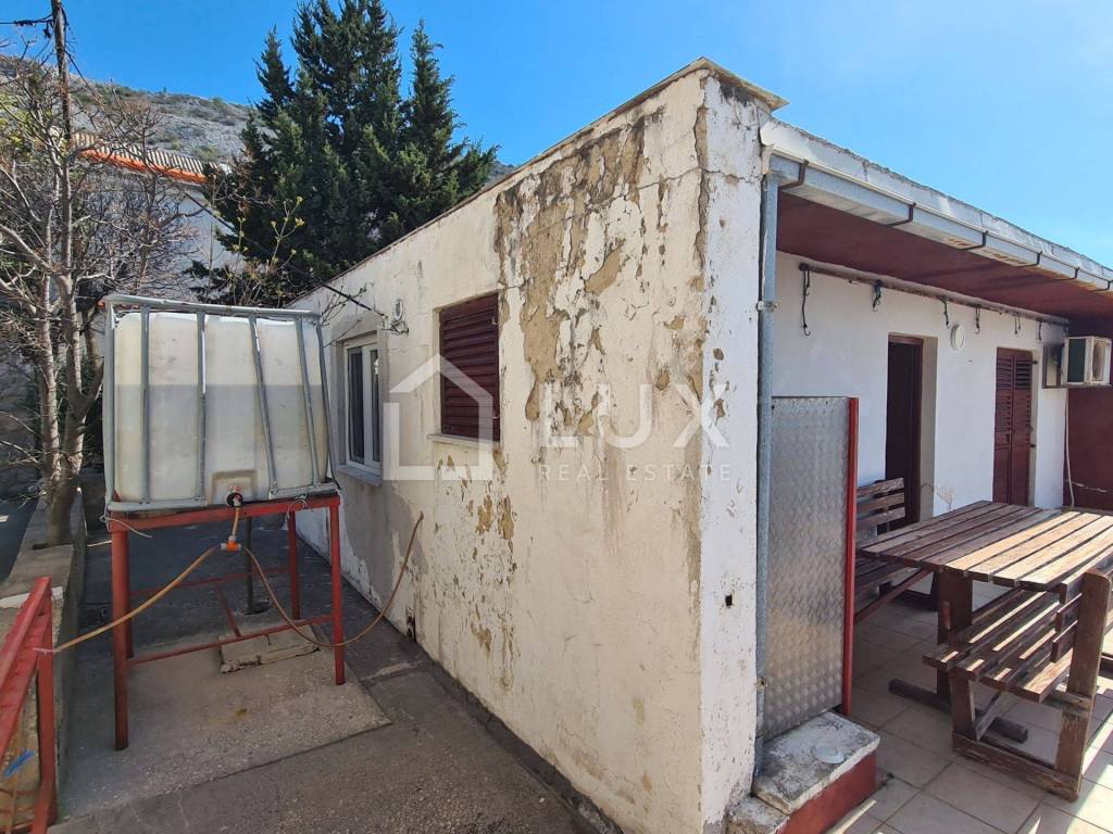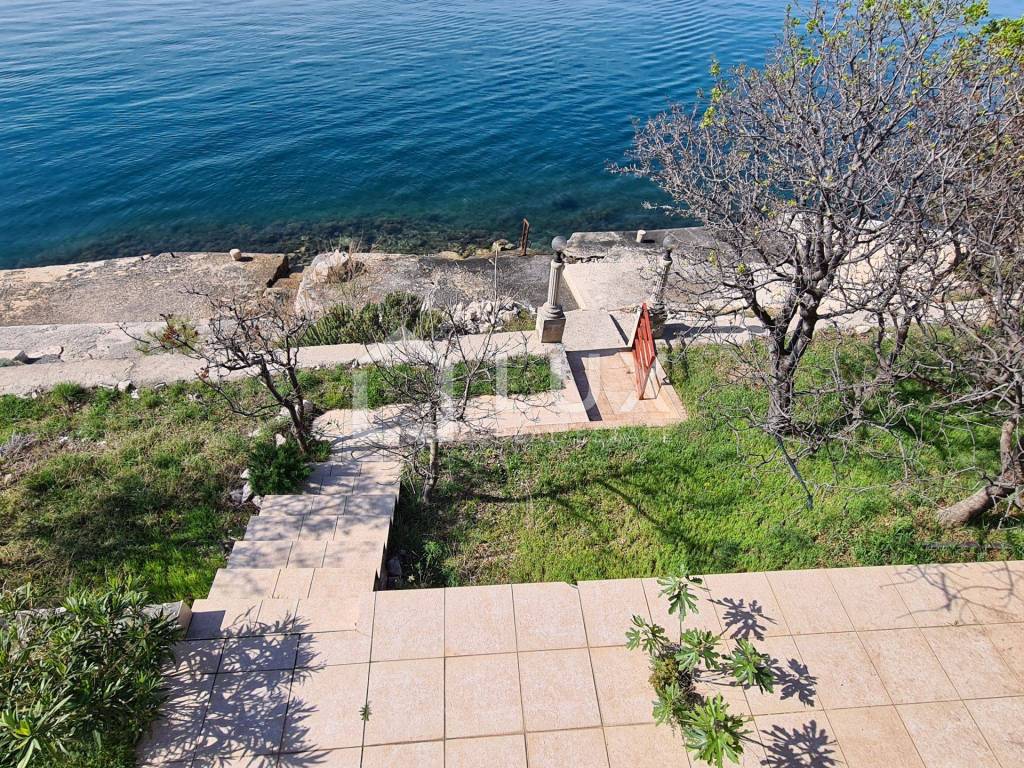 The residential part of the house covers 104m2: - the ground floor of 27m2 is currently a space for socializing with a bathroom, a - the first floor is a 77m2 apartment consisting of an entrance hall, kitchen, living room, 2 bedrooms and a bathroom, with a terrace with an open view of the sea and the islands.
