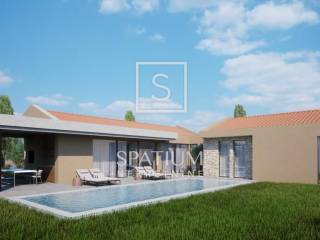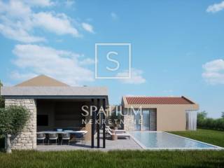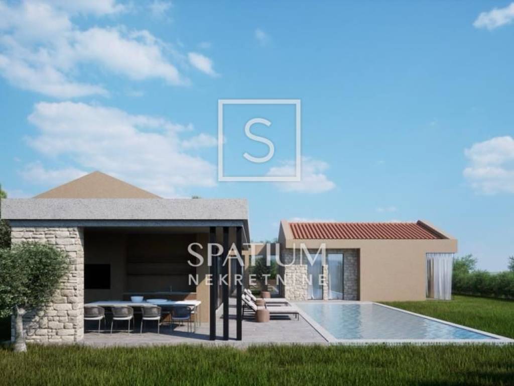 BUJE, We are offering a modern single-storey villa in the low shell construction phase, located on a plot of approximately 1,000 m², with panoramic views of the sea and surrounding nature.