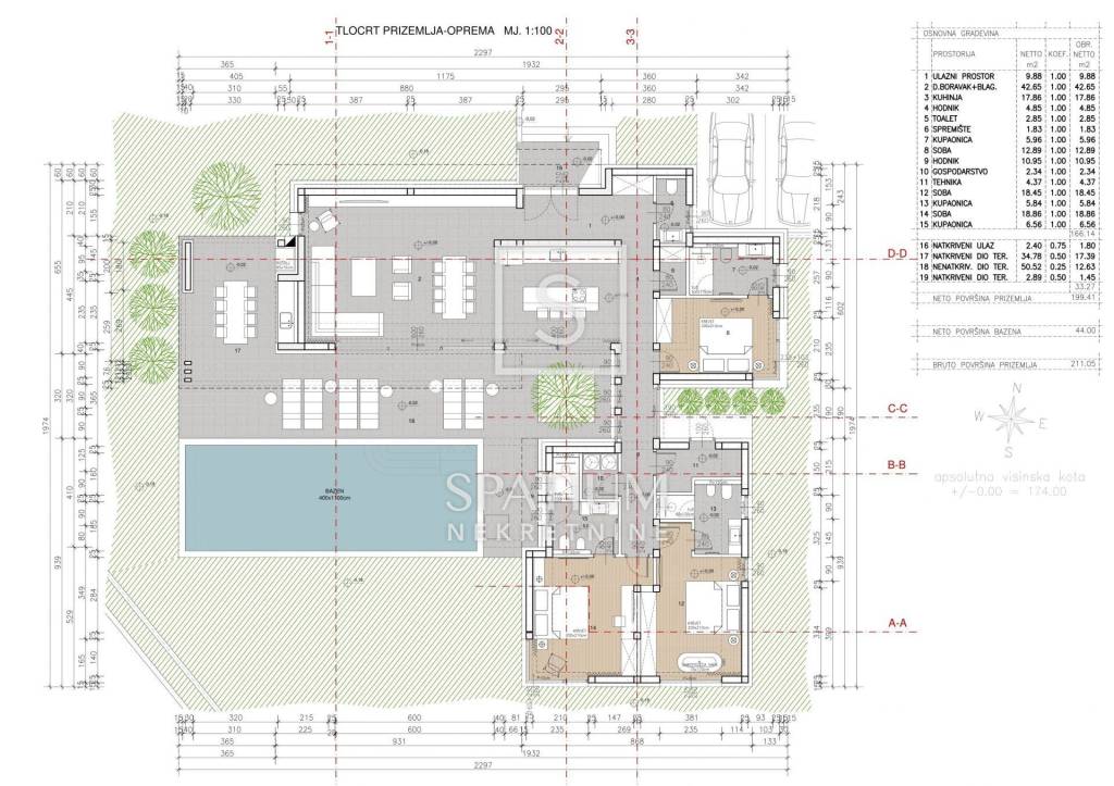 According to the main project, the villa extends over a net area of approximately 200 m², while the pool has an area of 44 m². The architectural design features a modern horizontal form with clean lines and large glazed openings that connect the interior with the exterior, maximize natural light, and provide views of the surrounding landscape.
