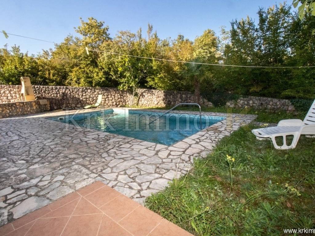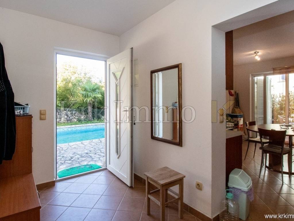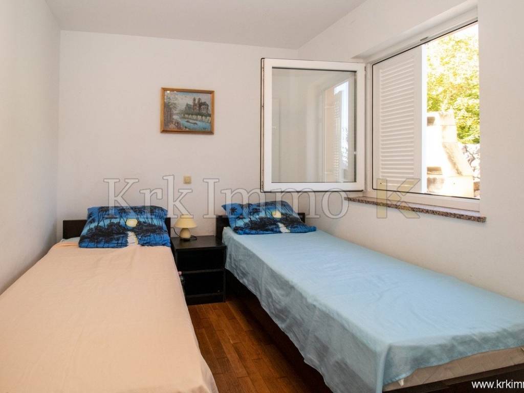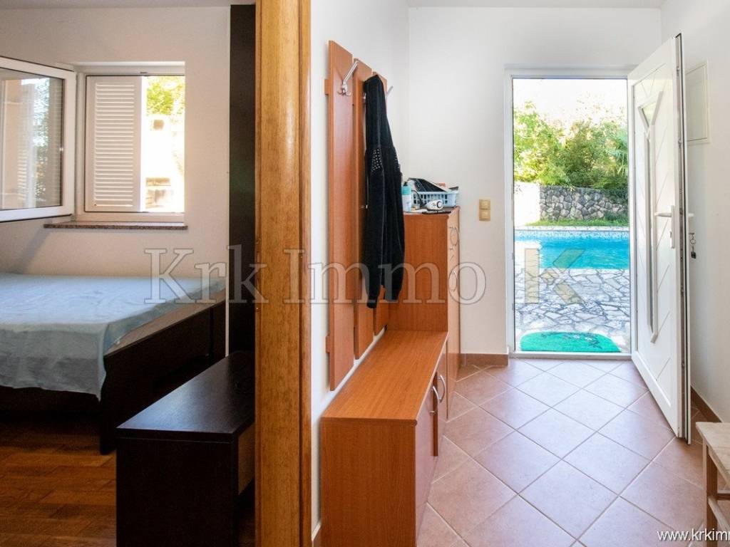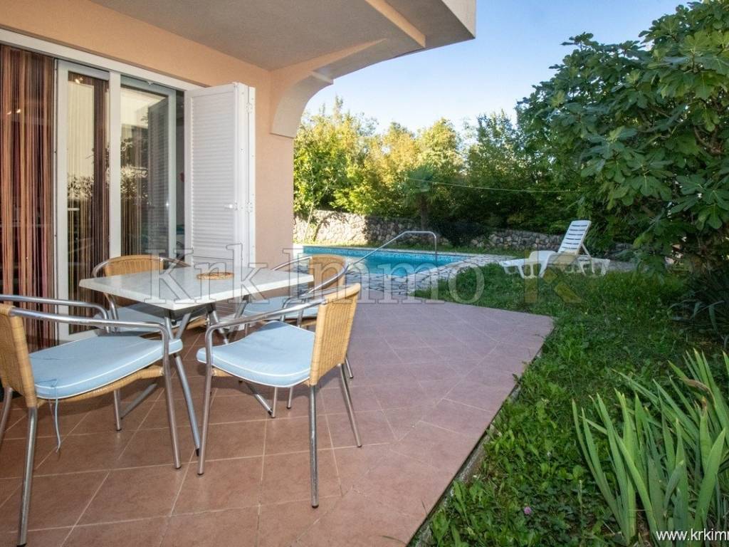 The apartment consists of a hallway, two bedrooms, a bathroom, a separate toilet, a kitchen, a dining area, and a living room. From the living room, there is access to a covered terrace, ideal for relaxing in the shade, while the spacious 100 m² garden with a 29 m² pool provides your private oasis on the island of Krk.