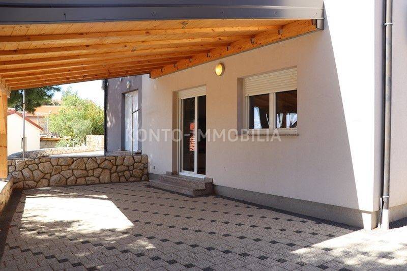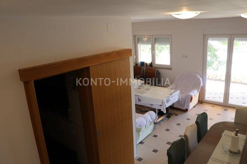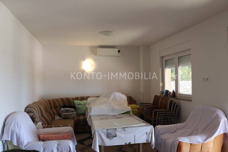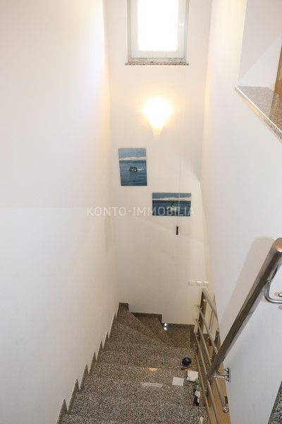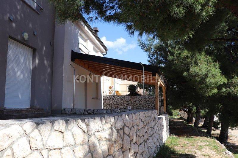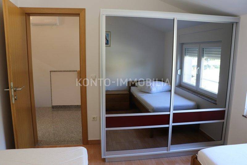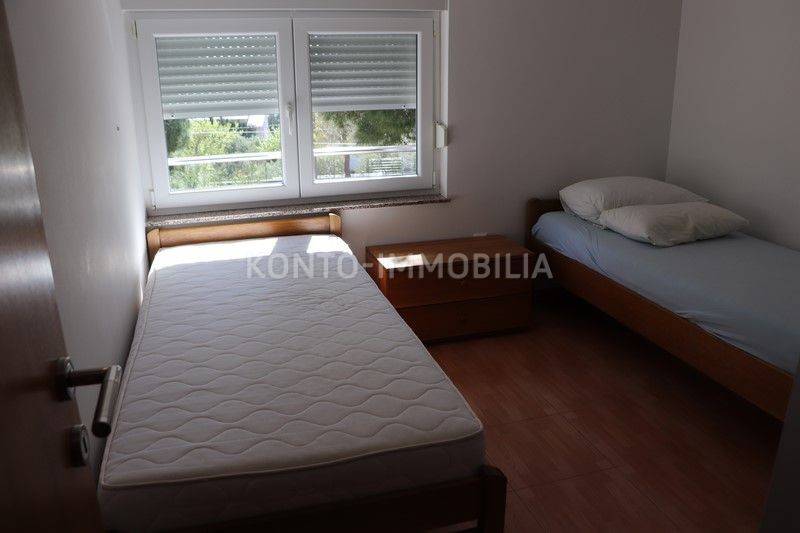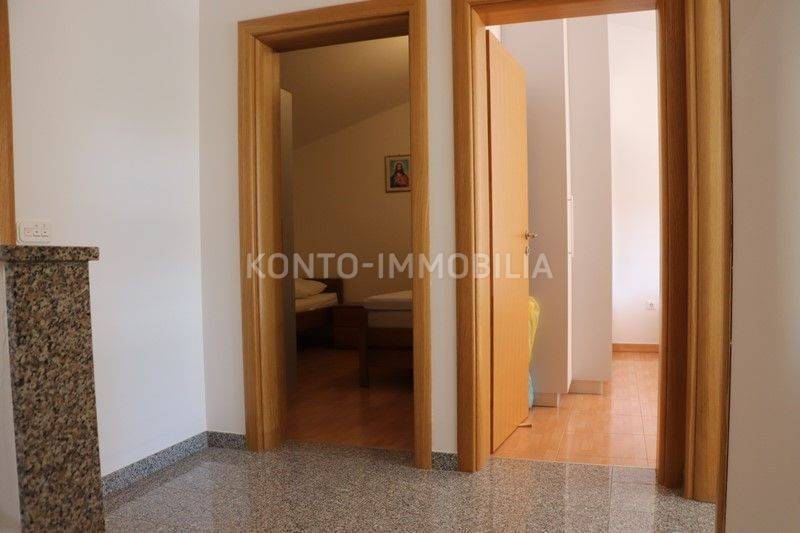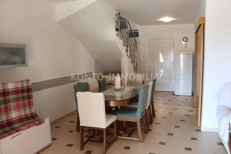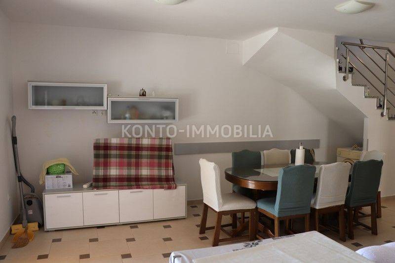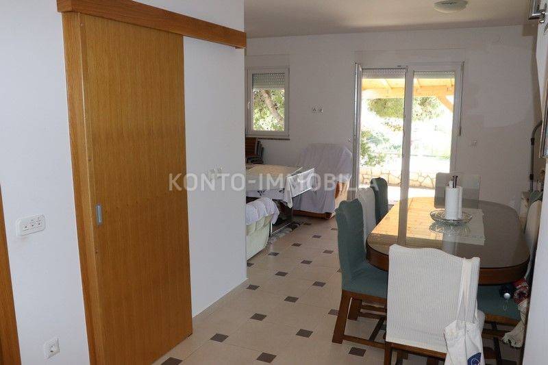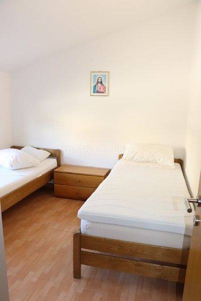 A beautiful two-story apartment only 200 m from the beach, with its own yard and a beautiful view of the sea. On the ground floor there is a kitchen with a dining room and a living room, a bathroom, a storage room and a covered terrace, while on the first floor there are three bedrooms and a bathroom. The apartment is furnished, equipped with two air conditioners, preparations have also been made for underfloor heating, possible installation of solar panels (implemented installation), chimney, ceramics placed on the floors, PVC openings with blinds, thermal facade d=8 cm. Parking in the yard.
