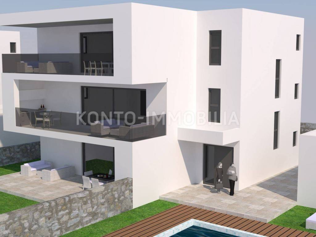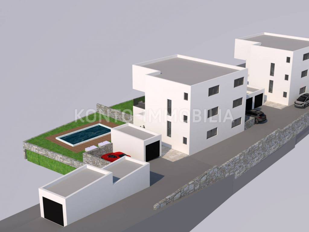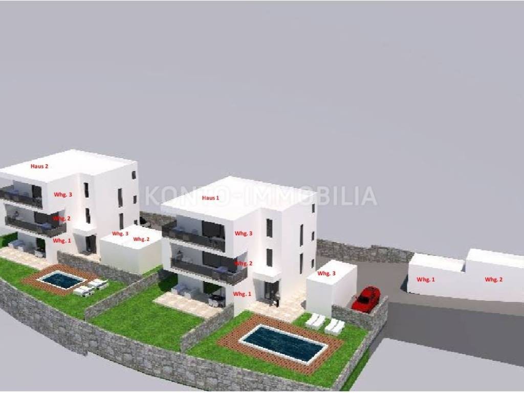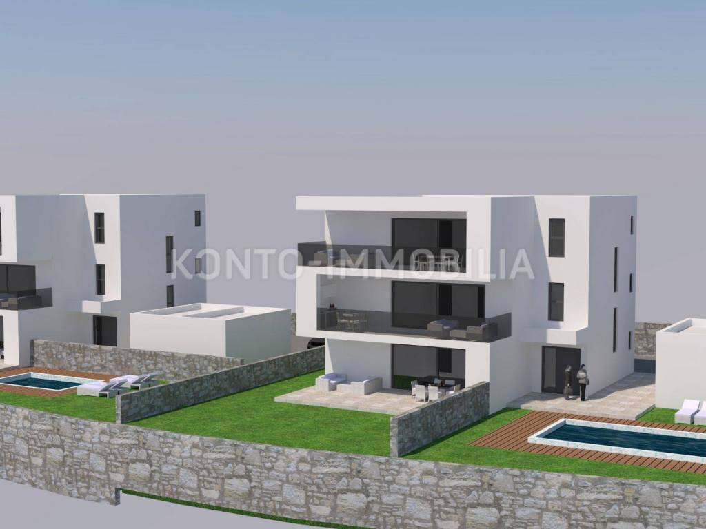 The future facilities are located in a quiet, elevated location, about 600 m from the sea and about 2 km from the center of Rab. The apartments will have an area of about 110 m2 net, with spacious terraces (25 m2) and a garage of about 18 m2. The apartment on the ground floor has a part of the garden / garden in front of the apartment, while in the second part of the garden there is a shared swimming pool and sunbathing area.