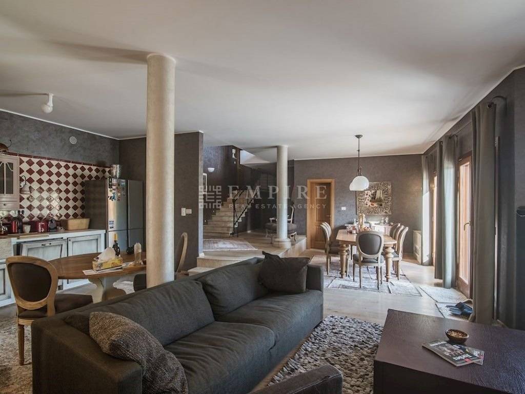 On the upper floor, there are 3 bedrooms with private bathrooms and a spacious terrace. The house is furnished with designer furniture.