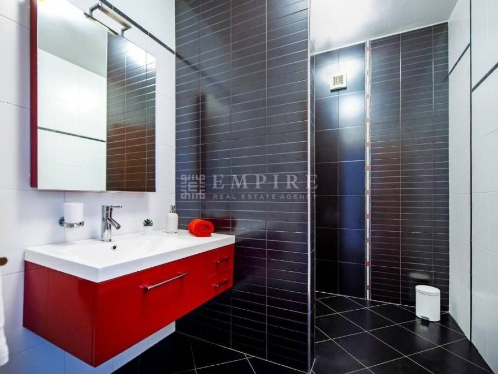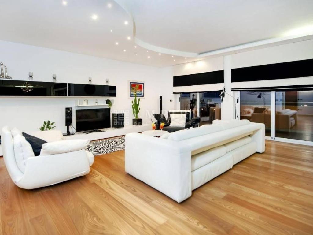 The villa spans two levels: On the ground floor, you’ll find a spacious and fully equipped apartment, as well as a tavern with a kitchen and toilet, fully equipped for comfortable gatherings. Both the tavern and apartment have direct access to a covered terrace, in front of which is an impressive heated pool (32 m²) with a sunbathing area and an outdoor kitchen. In the other part of the ground floor, there is a large garage for two cars.