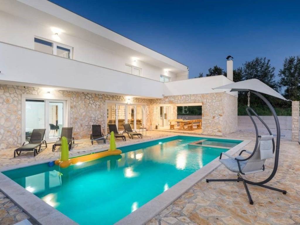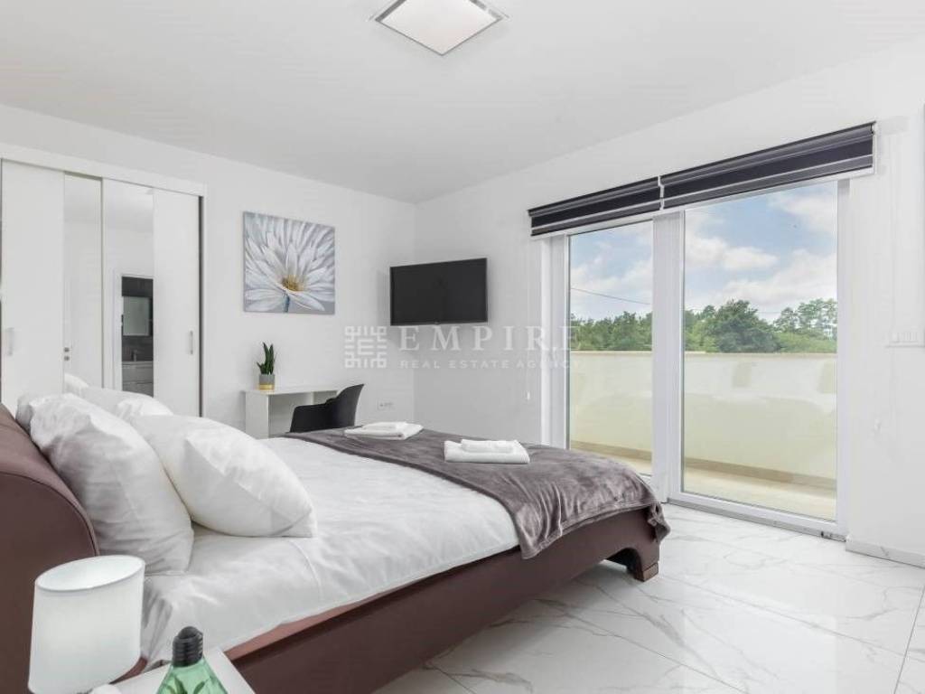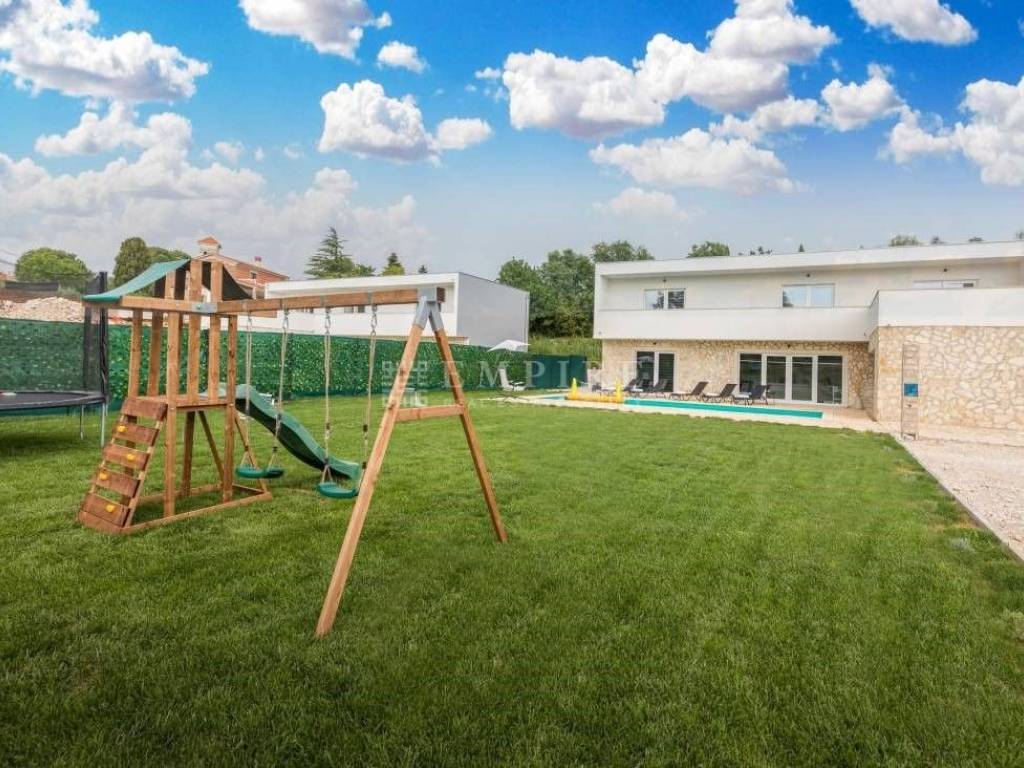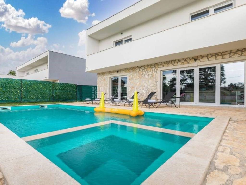 Beautiful new house with a pool, located in the oldest part of a peaceful settlement. 19 km from Pula (center and airport), 29 km from Rovinj, and 9 km from Fažana, 80 km from Rijeka, 240 km from Zagreb. It has 243 m² (net area including terraces), of which 163 m² is living space. The house consists of 4 bedrooms, each with its own bathroom and access to the upper terrace. The ground floor features living areas, a living room, kitchen, dining room, and a bathroom, leading to the lower terrace with a relaxation area and barbecue. The pool is 40 m² (10x4 m) with a jacuzzi. The house is near shops, a restaurant, a soccer field, and a hair salon, all within 100 meters. The house is in tourist rental, fully furnished, and sold as such.