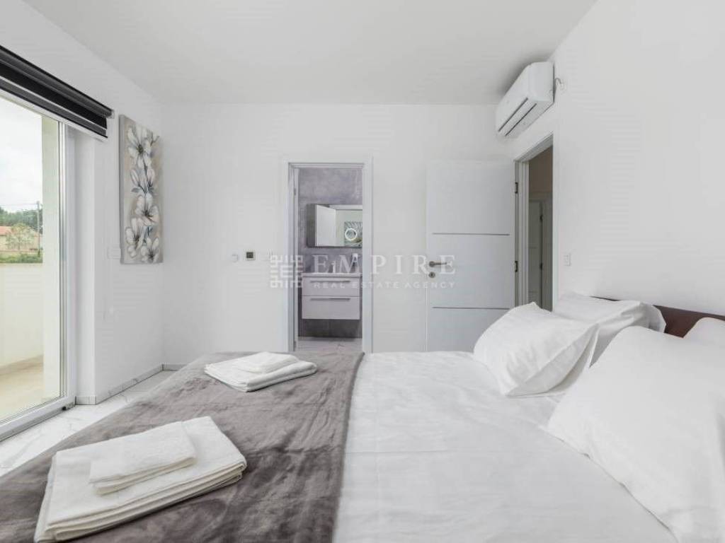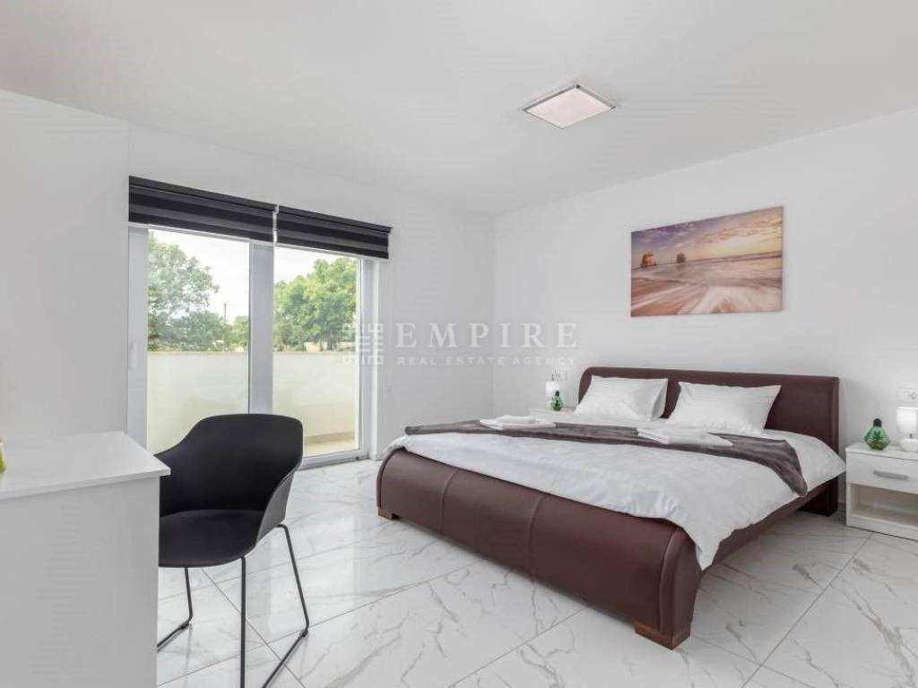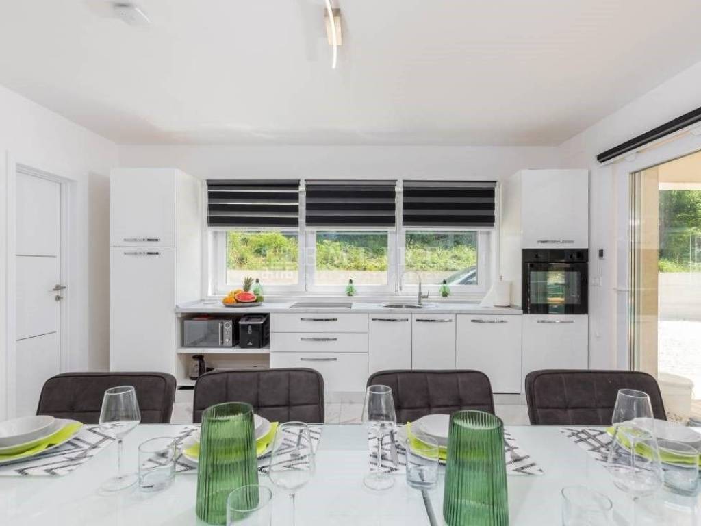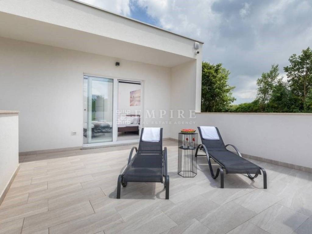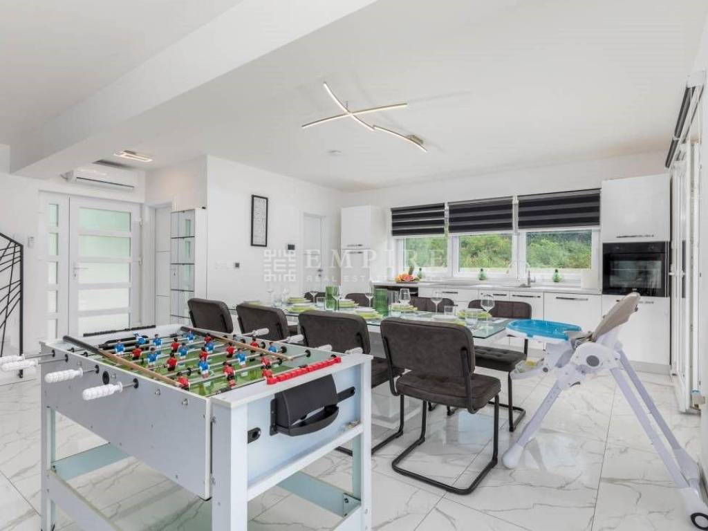 Beautiful new house with a pool, located in the oldest part of a peaceful settlement. 19 km from Pula (center and airport), 29 km from Rovinj, and 9 km from Fažana, 80 km from Rijeka, 240 km from Zagreb. It has 243 m² (net area including terraces), of which 163 m² is living space. The house consists of 4 bedrooms, each with its own bathroom and access to the upper terrace. The ground floor features living areas, a living room, kitchen, dining room, and a bathroom, leading to the lower terrace with a relaxation area and barbecue. The pool is 40 m² (10x4 m) with a jacuzzi. The house is near shops, a restaurant, a soccer field, and a hair salon, all within 100 meters. The house is in tourist rental, fully furnished, and sold as such.