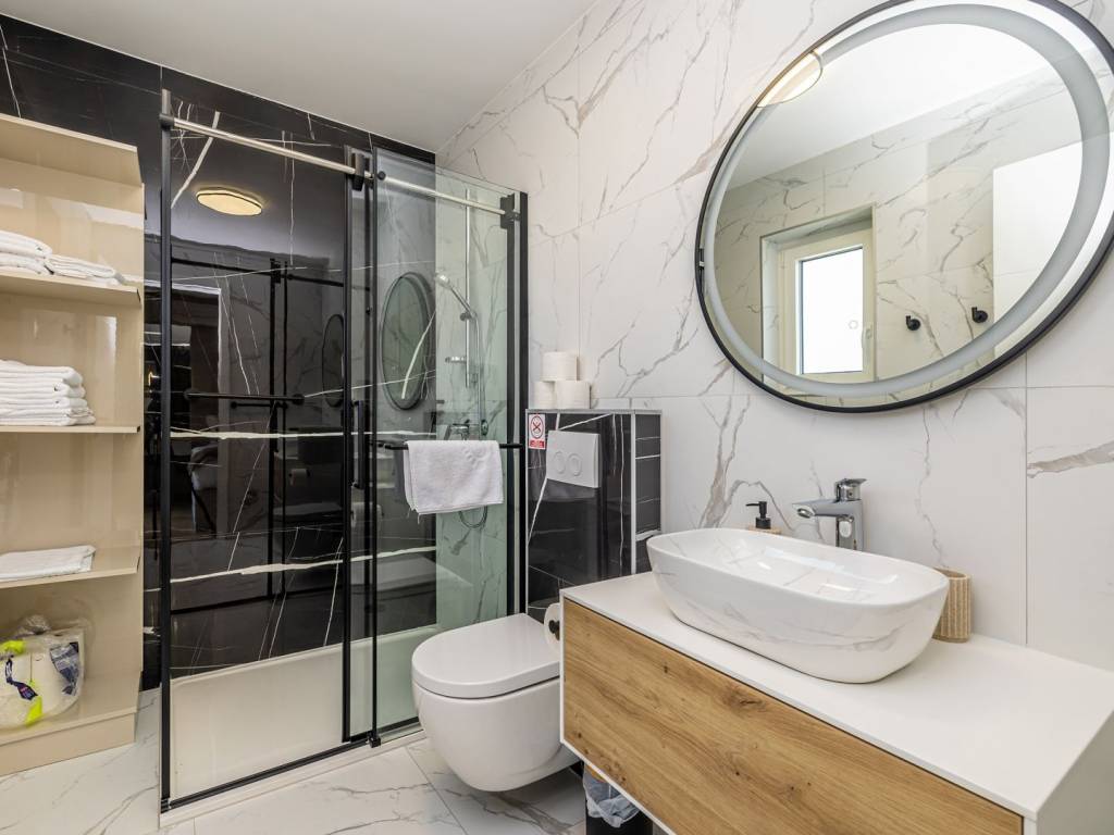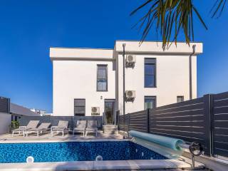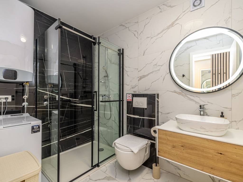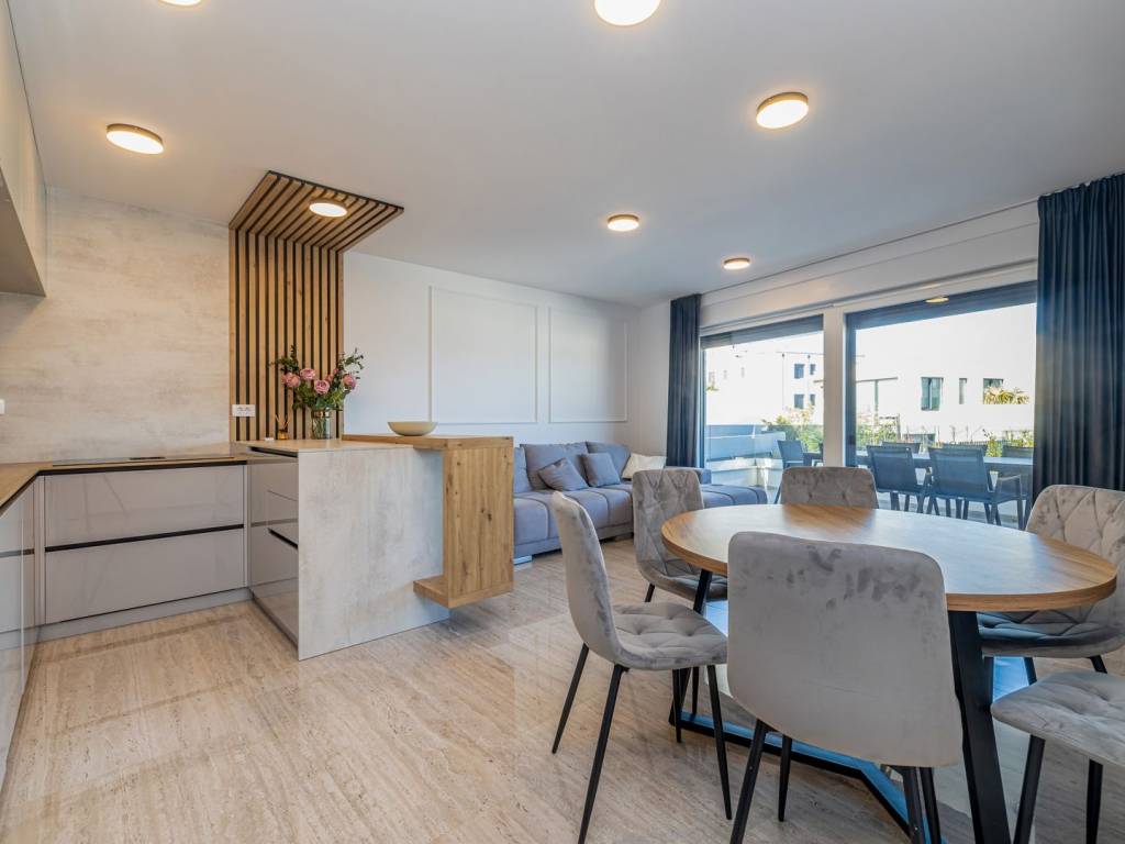 In a prestigious part of the coast, just 200 meters from the crystal clear sea, is this elegant apartment that perfectly combines modern design, comfort and Mediterranean lifestyle. The interior has been designed with attention to detail - three spacious bedrooms offer maximum privacy and a pleasant atmosphere. The master bedroom has its own luxurious bathroom, while the other two share a modern bathroom. An additional toilet provides additional practicality, especially when you have guests. The open-concept living room is connected to the dining room and kitchen, creating a pleasant space for socializing and relaxing. Large glass walls let in plenty of daylight and water onto the spacious covered terrace - the perfect place to drink your morning coffee or enjoy warm summer evenings. What makes this property special is the private pool located in a beautifully landscaped courtyard. Right next to it is a fully equipped summer kitchen, perfect for preparing delicious meals outdoors. With sun loungers by the pool and greenery surrounding the space, this corner provides a true oasis of peace and enjoyment. The apartment is equipped with high-quality materials, modern furniture and all the amenities needed for a luxurious and carefree life. Its prestigious location, proximity to the sea and top-notch equipment make it an excellent investment, whether for personal use or tourist rental.