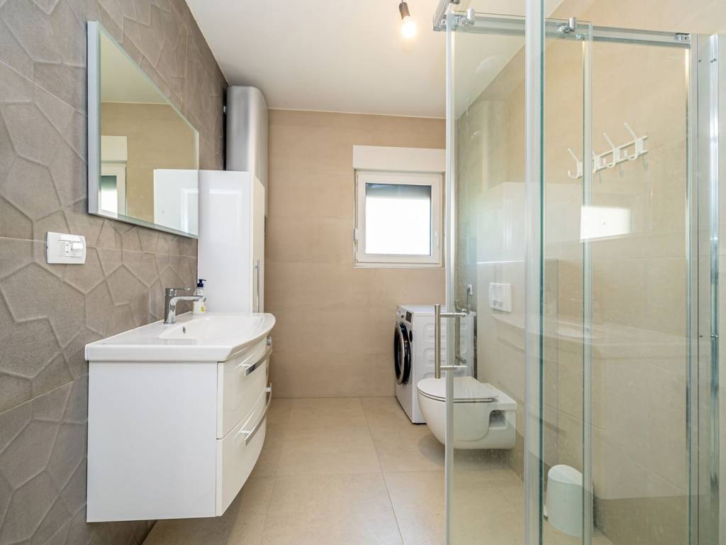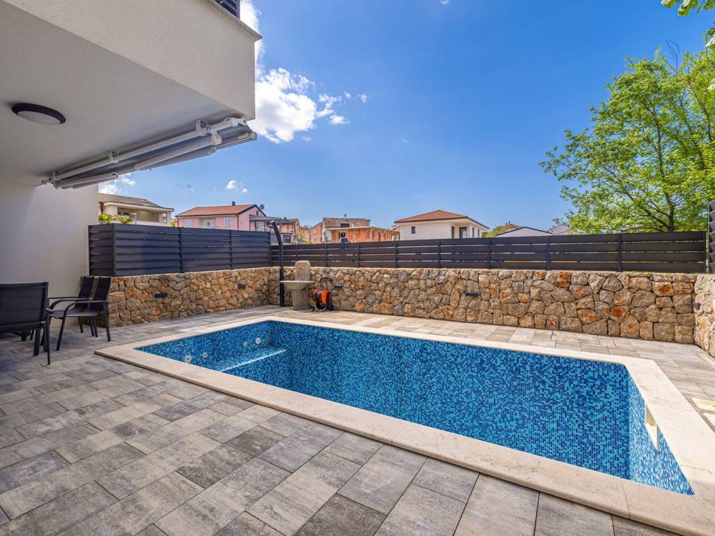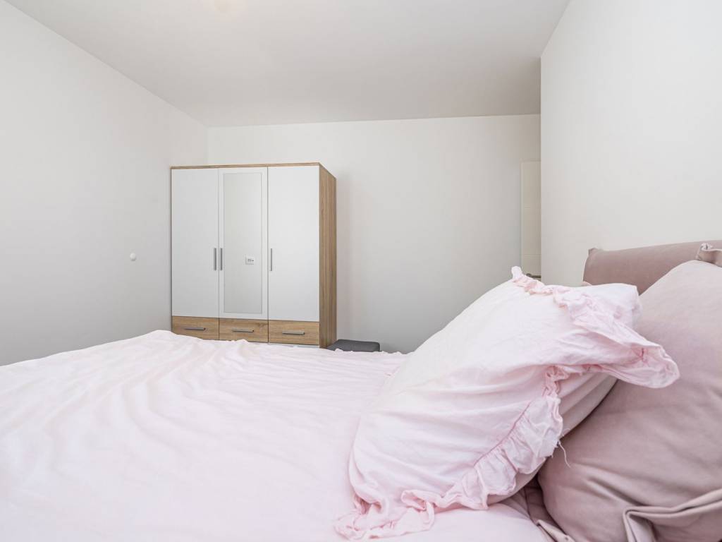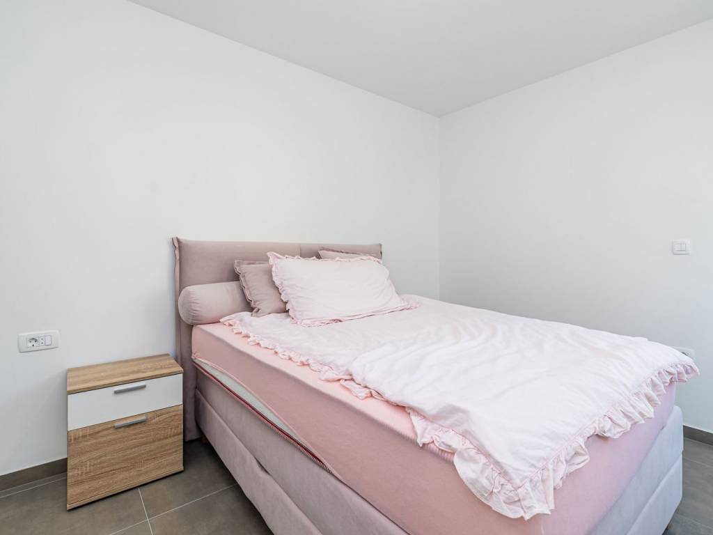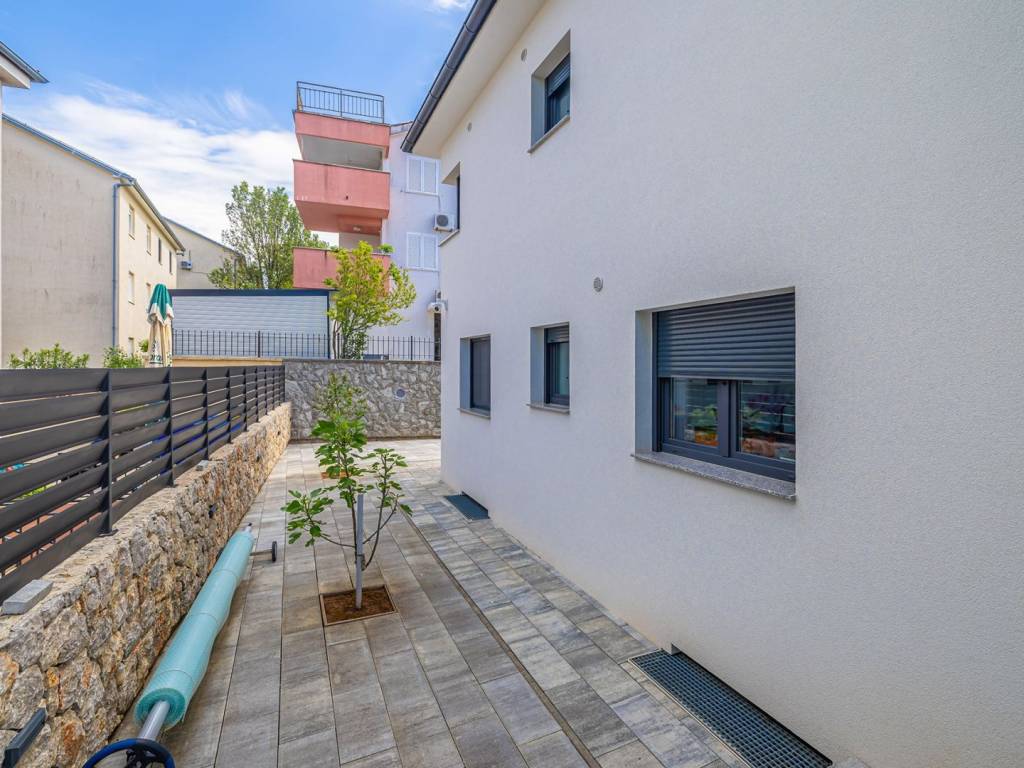 In a quiet part of Malinska on the island of Krk, there is an elegant, newly built semi-detached house with a total living area of 128 m2. Just a few minutes from the sea, this property offers the perfect combination of comfort, modern materials and a functional layout - with a heated private swimming pool, a landscaped and fenced garden and two parking spaces. The house extends over three floors - basement, ground floor and first floor - connected by an internal staircase. In the basement there is an additional bedroom, a spacious living room (with the possibility of installing a kitchen), a bathroom, a hallway and a practical storage room. Some of the furniture for the living room is already available and packed, and the future owner can assemble it and arrange the space according to their own wishes - perfect for guests, a private zone or a hobby space. The ground floor is the heart of the home with a modernly designed living room, kitchen and dining room with access to a covered terrace and a sundeck by the pool. There is also one bedroom, a bathroom and a hallway. The first floor houses two comfortable bedrooms, a hallway, a modern bathroom and a covered terrace – ideal for morning coffee or evening relaxation outdoors. The house is equipped with quality materials and smart solutions: underfloor heating in all rooms except the basement, air conditioning in every room (except in the basement where there is one air conditioning unit), mosquito nets on windows and doors, PVC joinery with triple glazing and electric shutters. The bathrooms have top-quality ceramics and sanitary ware, and additional security is provided by a video surveillance system with three cameras. The fenced yard has a heated swimming pool with a machine room and a sunbathing area, and two parking spaces are provided in front of the house. This property offers everything you need for a comfortable family life, but it is also an excellent choice for tourist rental. Contact us for more information or to arrange a viewing!