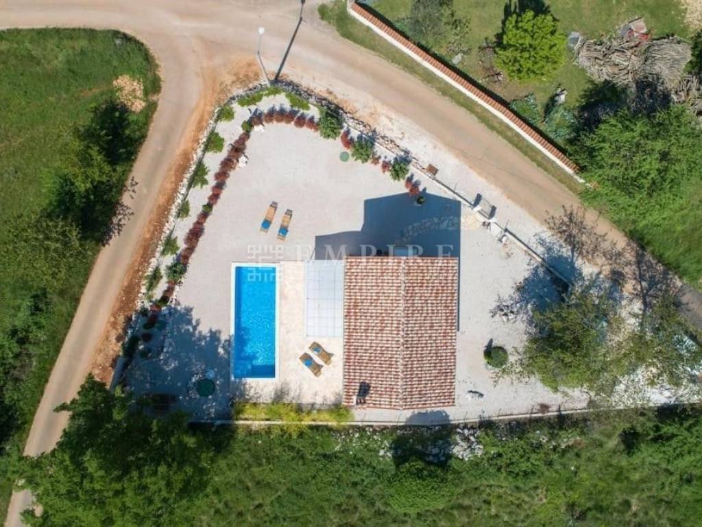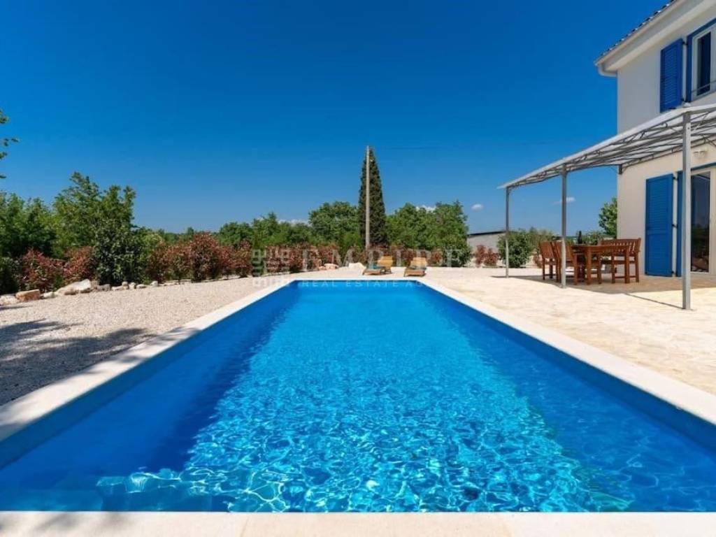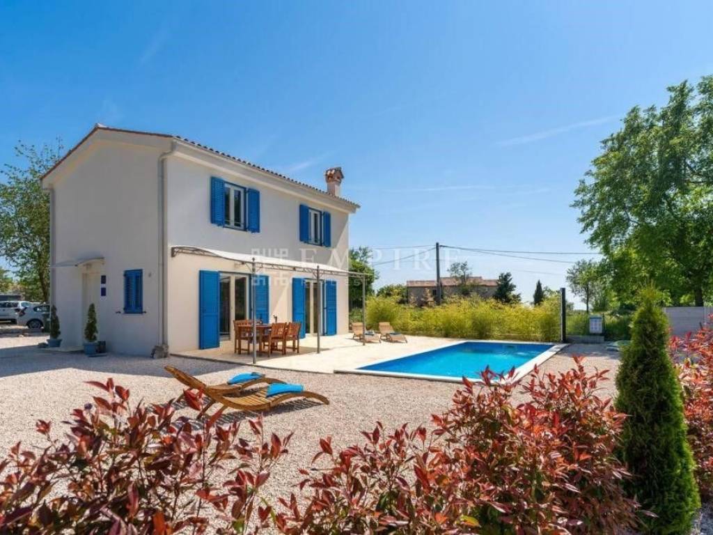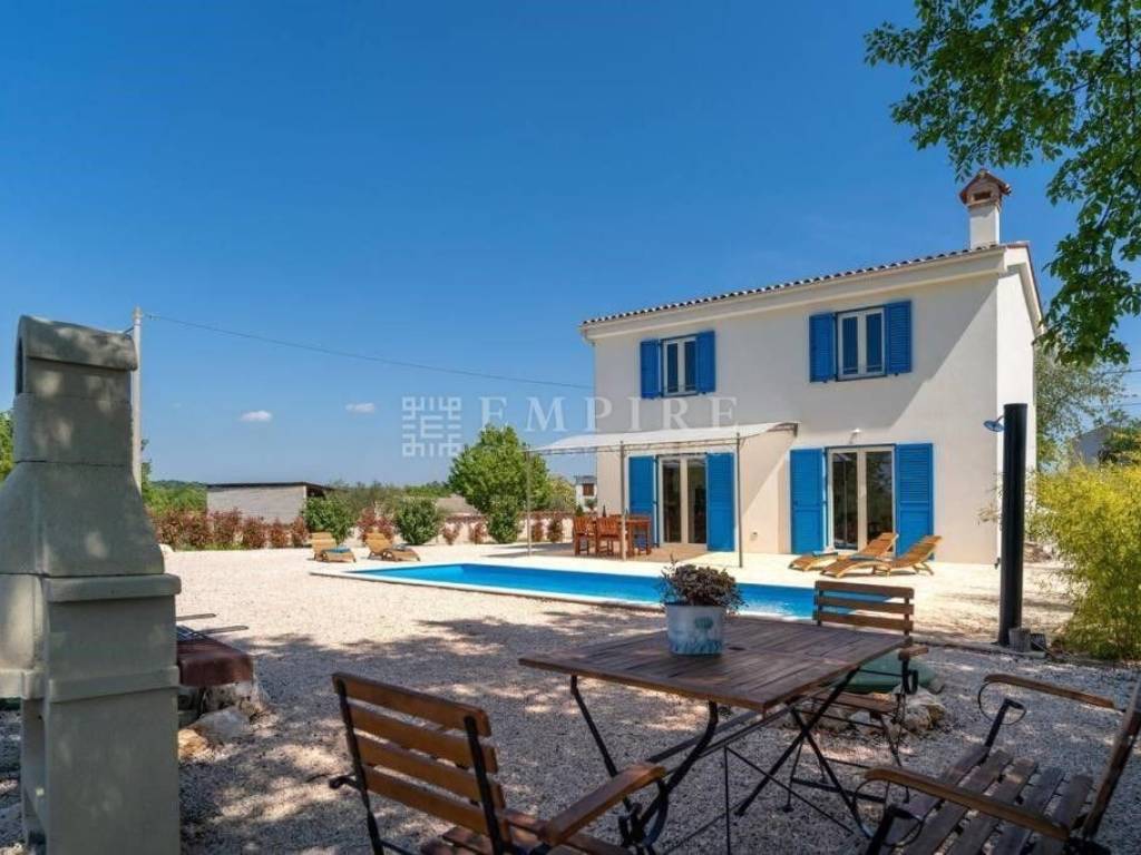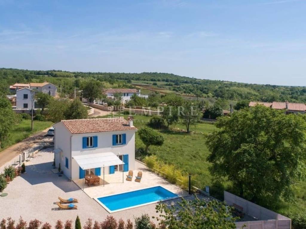 For sale is a beautiful detached house located in a peaceful area, surrounded by nature and greenery. The house, covering an area of 108 m², consists of an entrance space, a WC, storage room, kitchen, dining area, and a living room with access to the yard, where there is a 24 m² pool and a beautifully landscaped garden. Internal stairs lead to the first floor, where there are two bedrooms, each with its own bathroom. The property is fully equipped and furnished, with heating and cooling provided by air conditioning and a fireplace. The yard is completely enclosed and decorated with various plants. Two parking spaces are located in front of the house. This house is special because of its quiet location and classic architecture. It is 4 km from the town center, and the sea and Poreč city center are only 15 km away. For more information or to schedule a viewing, feel free to contact us!