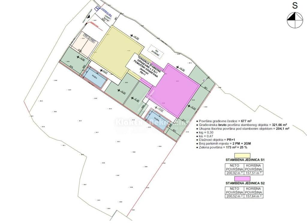 Residential unit S1 - two-storey semi-detached house with a net area of 157.51 m/2. It consists of a ground floor and an upper floor, a total of four bedrooms, one of which is a master bedroom with its own bathroom. The house has an outdoor swimming pool of 18 m/2, a garage, two parking spaces and a garden of 200 m/2.