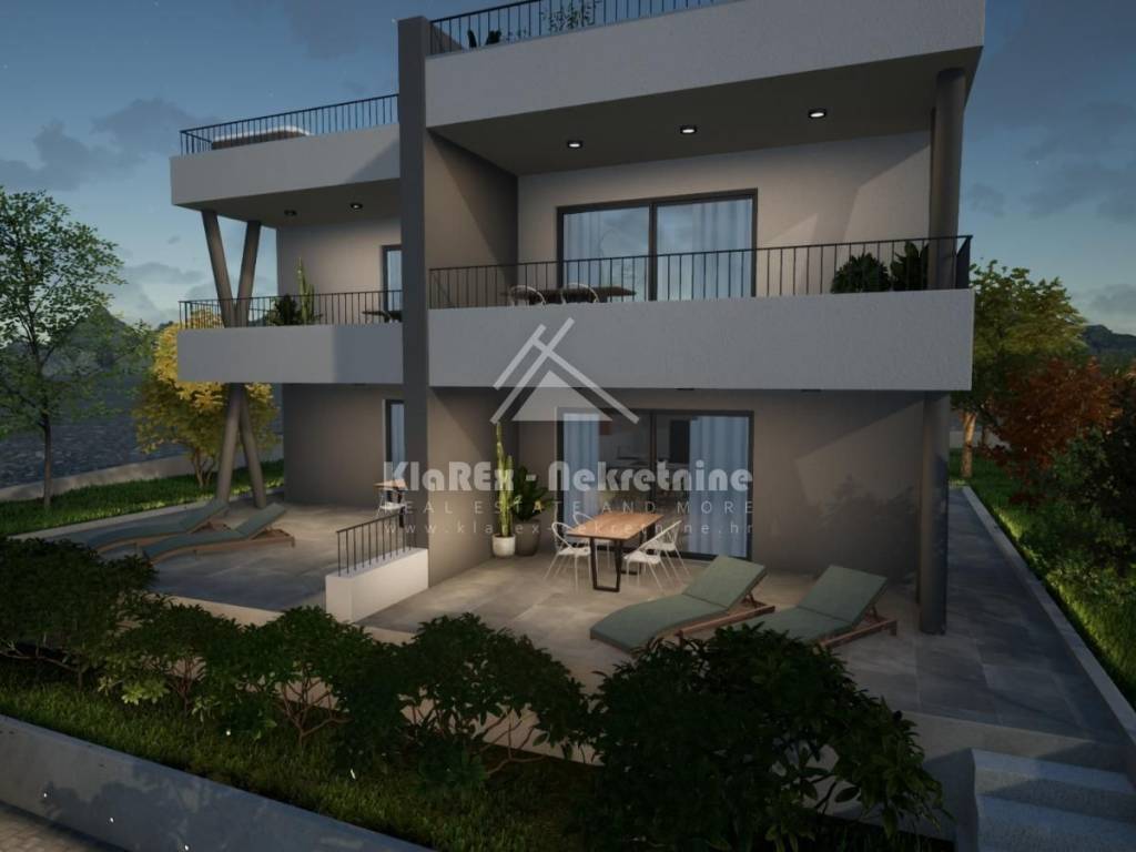 In Vodice, about 1800 meters from the sea, or the city center, two-bedroom apartments are being offered for sale, each with a view of the sea and the city of Vodice. The building is under construction, and the project is expected to be completed and ready for occupancy in the spring 2026. The building is being built according to modern construction standards, while the apartments will be equipped with quality equipment and materials such as: underfloor heating in all rooms, air conditioning in the living room and bedrooms, roller shutters with electric lifts, etc. The apartments on the ground floor are single-storey with their own gardens, while the apartments on the first floor are two-storey with their own terraces offering a beautiful view of the sea. The ownership is in order, the building permit has been issued. The offer includes: