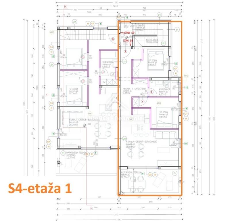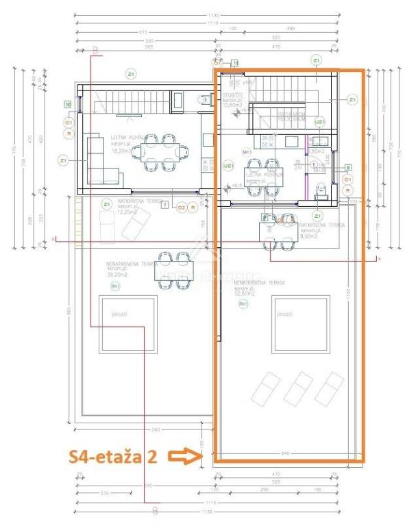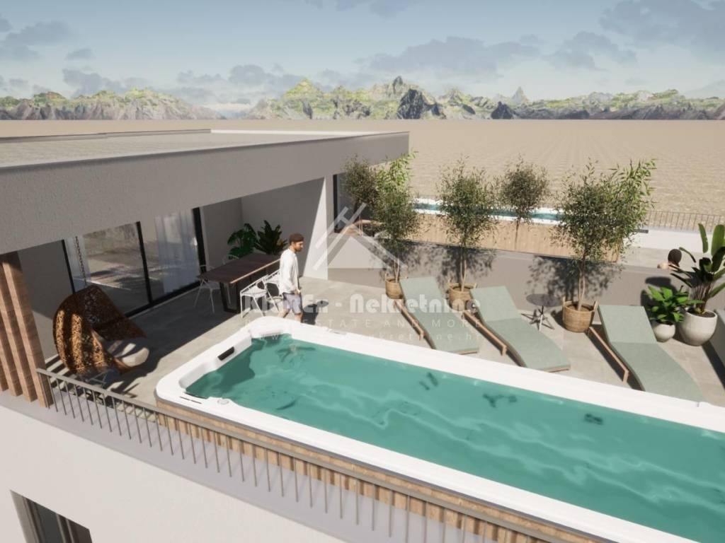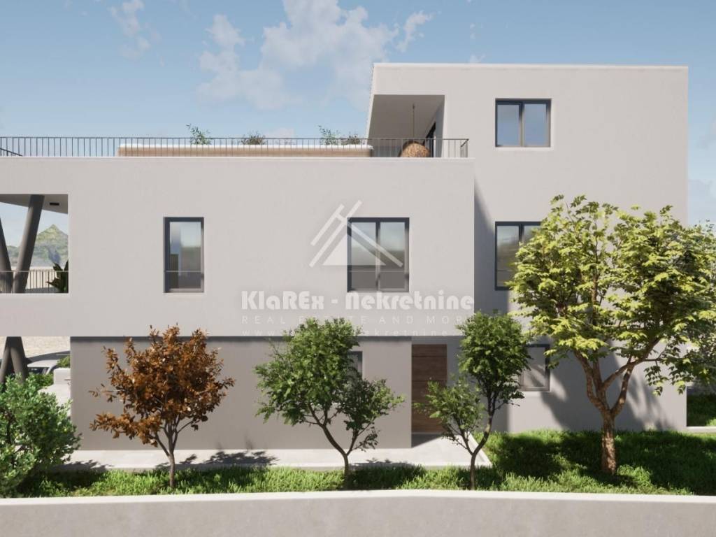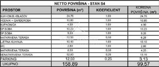 Residential unit S4, duplex apartment on the first and second floors of a residential building, net area of ​​99.57 m/2. The first floor of the apartment consists of: entrance hall with wardrobe, kitchen with living room and attached dining room, bathroom and two bedrooms. From the living room there is access to a covered terrace of 12.50 m/2. Furthermore, the internal stairs lead to the second floor of the apartment, which consists of a summer kitchen and a smaller toilet. From the summer kitchen there is access to a spacious, partially covered terrace with an area of ​​61.10 m/2, with a beautiful view of the sea and the city. The apartment has one parking space.