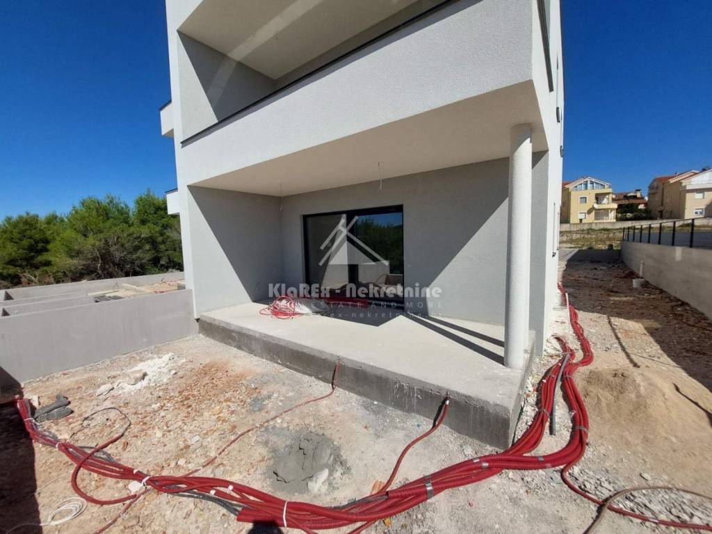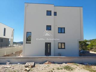 In Vodice, about 1800 meters from the sea, or the city center, two-bedroom apartments are being offered for sale, each with a view of the sea and the city of Vodice. The building is under construction, and the project is expected to be completed and ready for occupancy in the spring 2026. The building is being built according to modern construction standards, while the apartments will be equipped with quality equipment and materials such as: underfloor heating in all rooms, air conditioning in the living room and bedrooms, roller shutters with electric lifts, etc. The apartments on the ground floor are single-storey with their own gardens, while the apartments on the first floor are two-storey with their own terraces offering a beautiful view of the sea. The ownership is in order, the building permit has been issued. The offer includes: