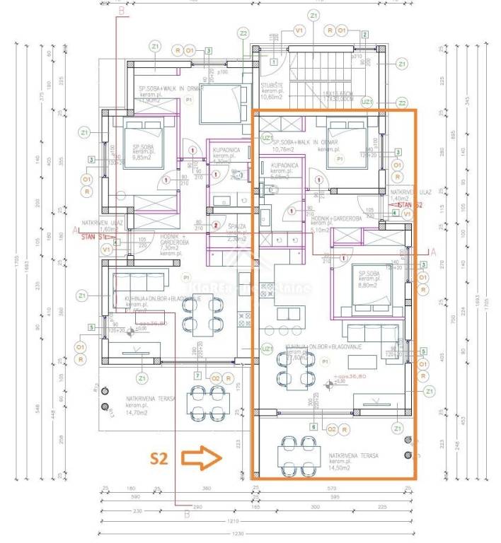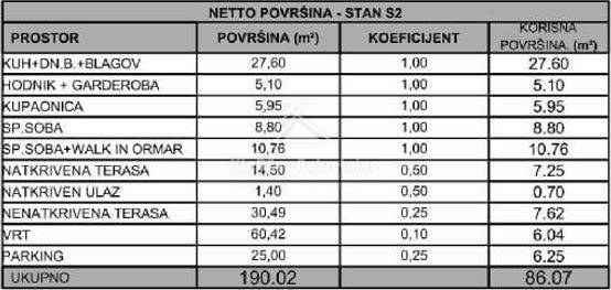 Residential unit S2 on the ground floor of a residential building, net area of ​​86.07 m/2. The apartment consists of: entrance hall with wardrobe, kitchen with living room and dining room, bathroom, two bedrooms, one of which has a walk-in closet. From the living room there is access to a partially covered terrace of 45 m/2. The apartment has a garden of 60.42 m/2 and two parking spaces.