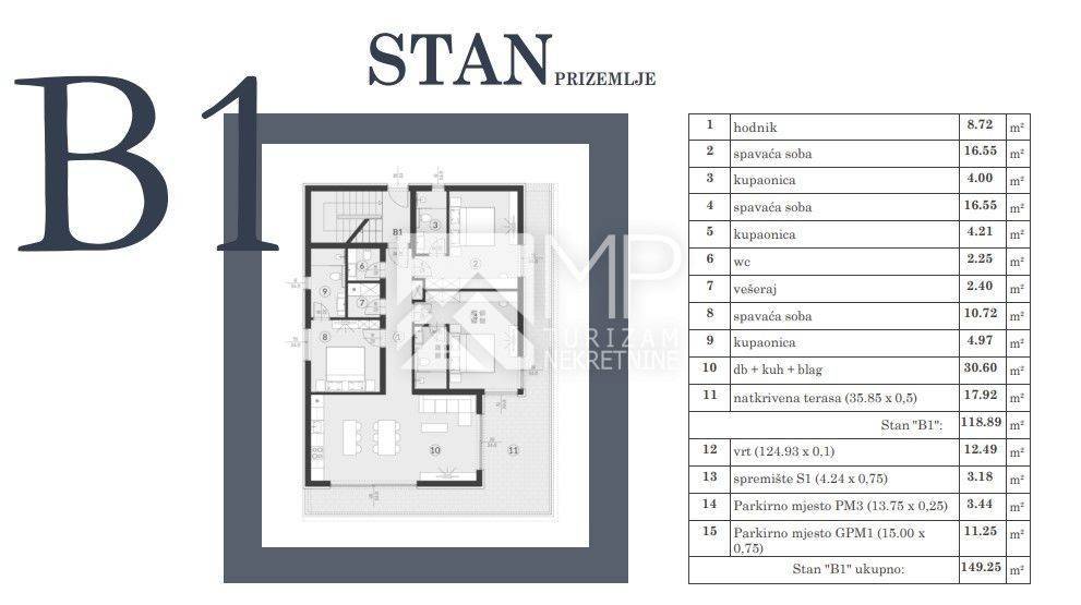 The property in question is located on the ground floor of building B, marked "B1", with a total area of ​​118.89 m2, and consists of: hallway, living room + kitchen + dining room, 3 bedrooms, each with its own bathroom, laundry room, additional toilet and covered terrace.