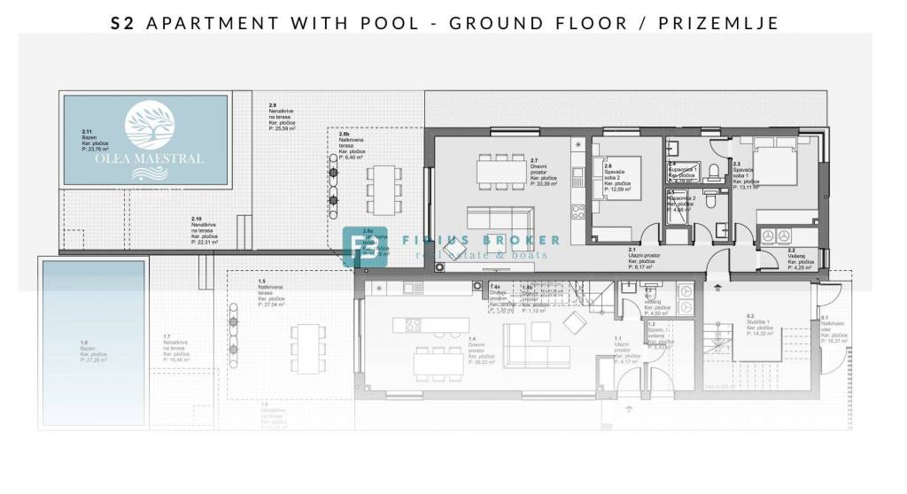 Apartment S2 has 125.91 m2 of net usable area (80.46 m2 of living space + 23.76 m2 of swimming pool + 138.83 m2 of garden + parking) and is located on the ground floor. It consists of an entrance hall, separate bathroom, laundry room, two bedrooms, one of which has its own bathroom, open space kitchen with dining room and living room that has access to a covered and uncovered terrace, garden, swimming pool and sundeck. The spacious apartment stands out with its modern design and functional layout, which ensures greater privacy and maximum comfort of living. One of the main advantages of this property is the private pool and landscaped yard, ideal for relaxing and enjoying the outdoors. The apartment comes with one parking space marked PM4.